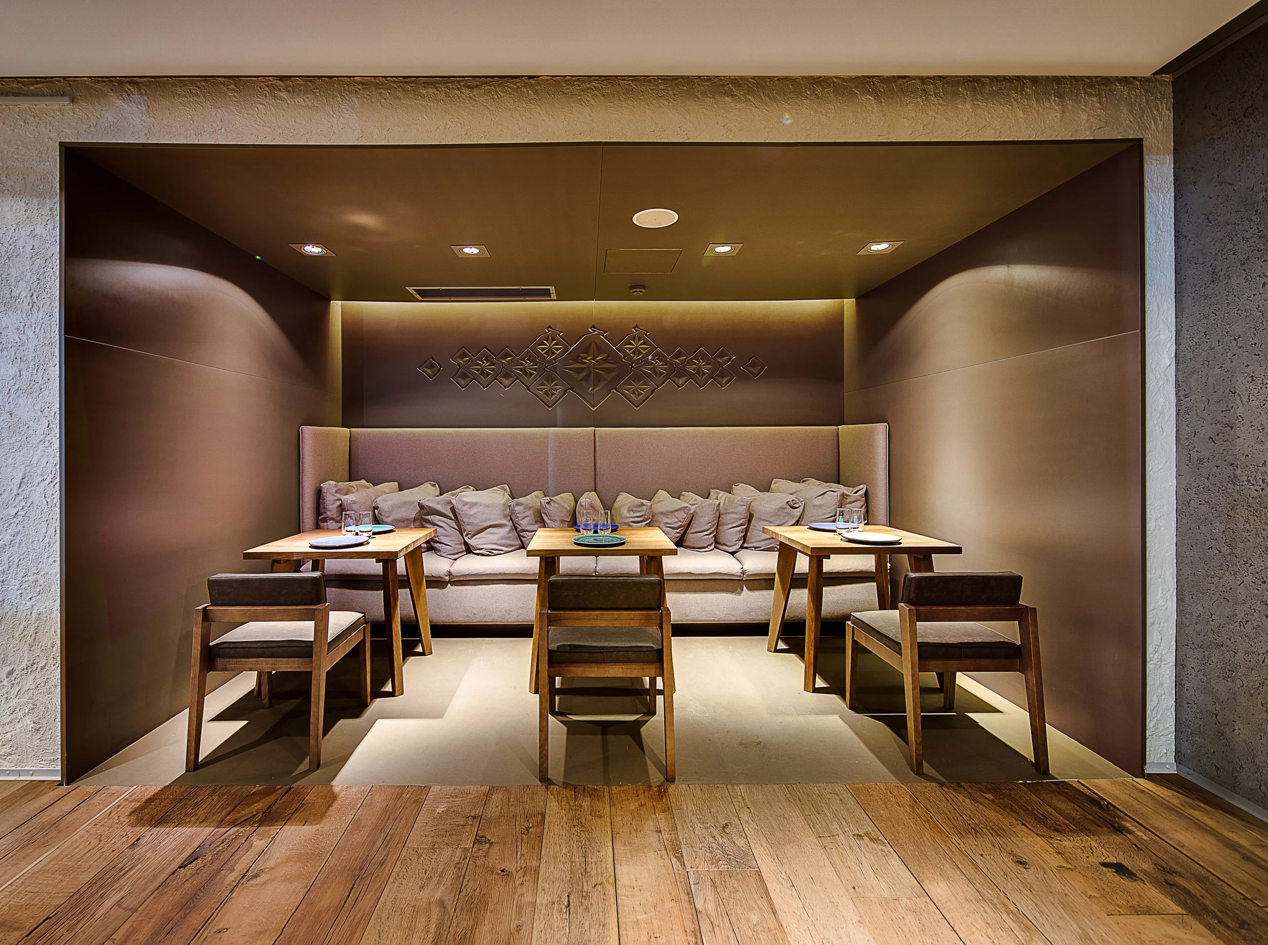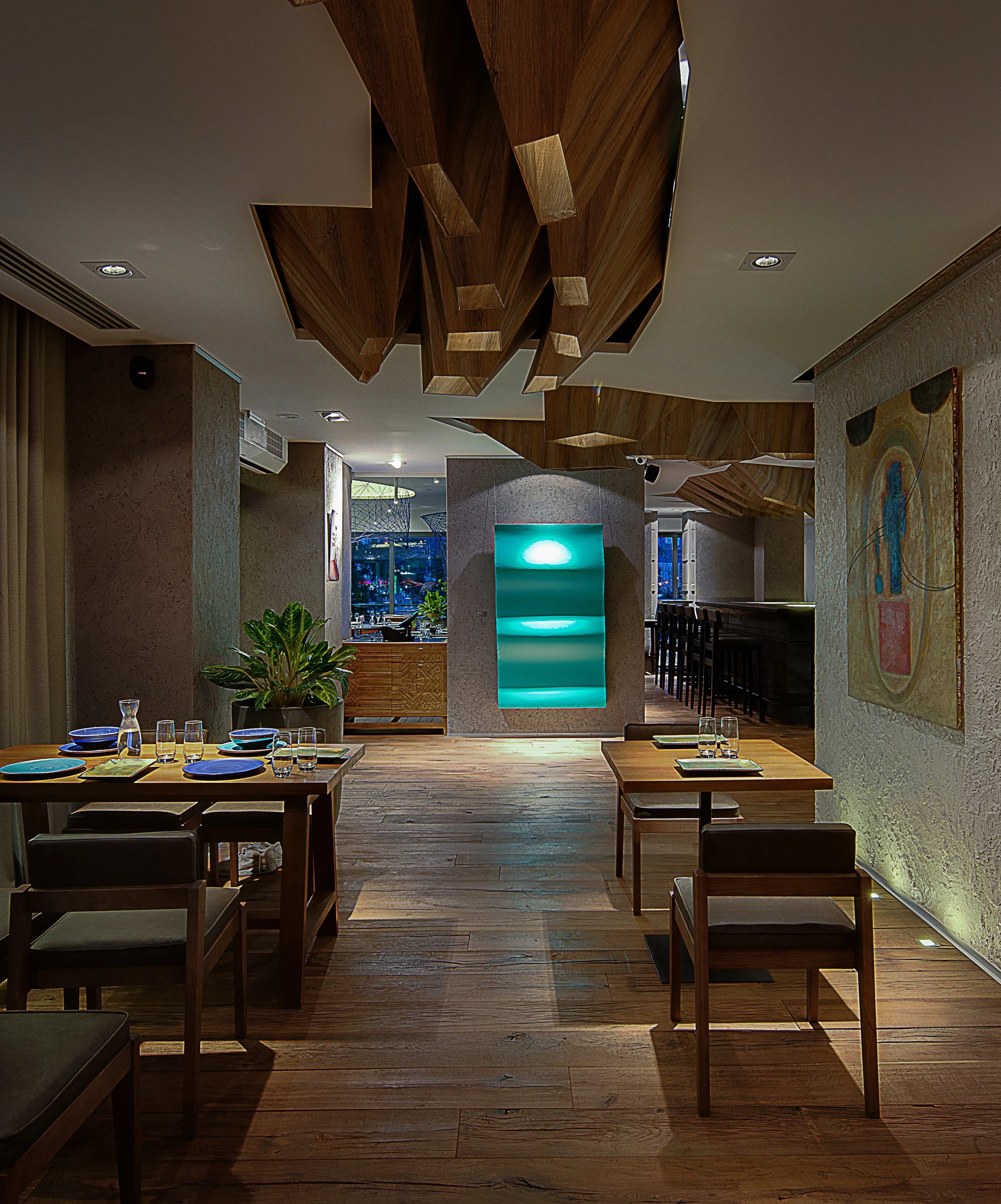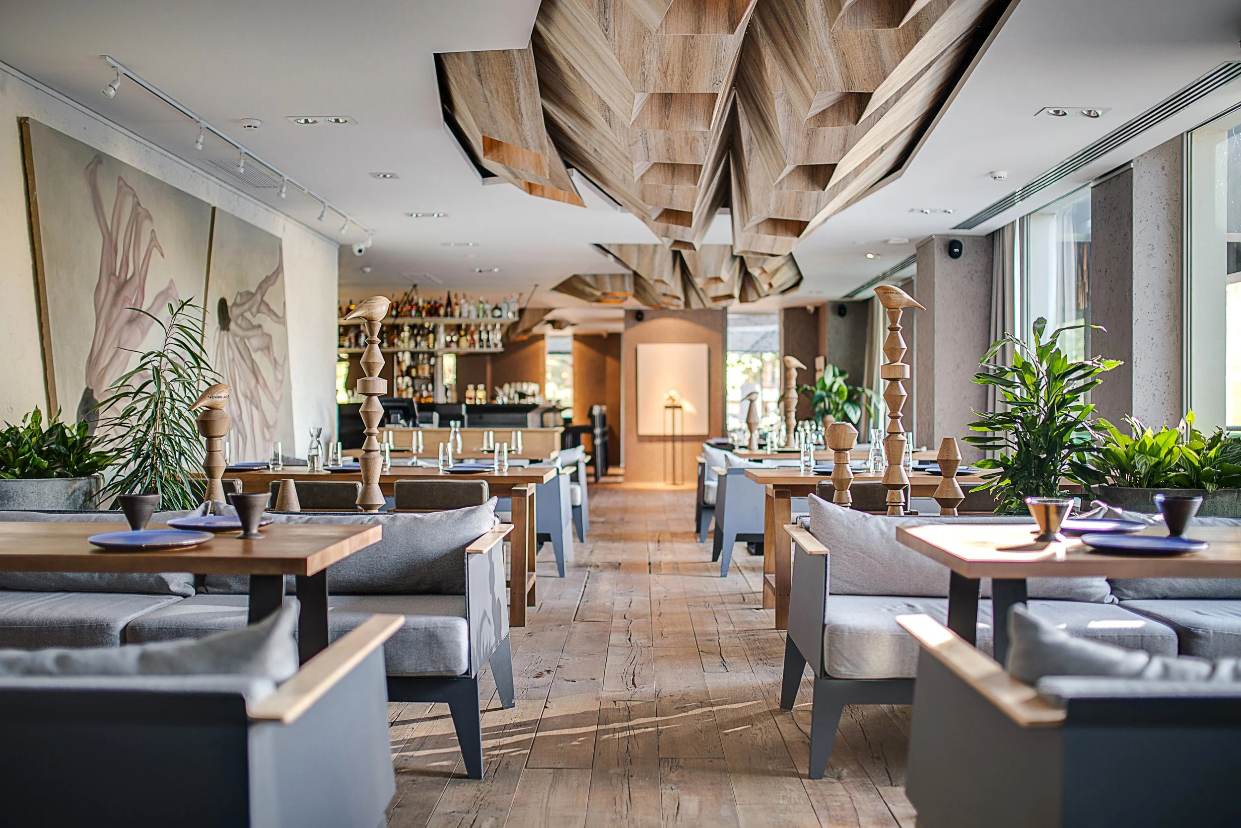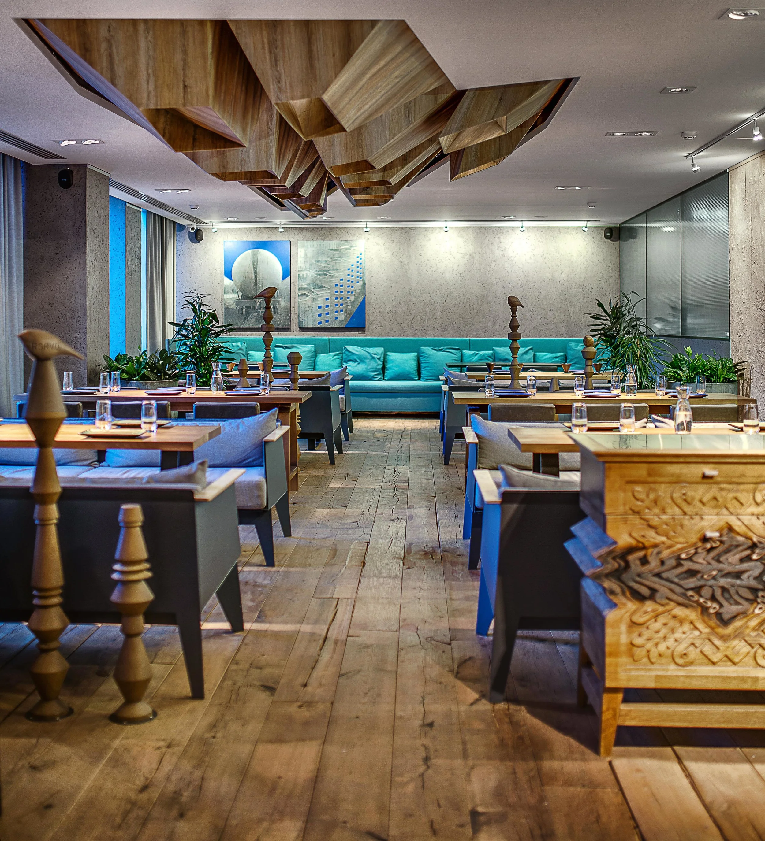 The restaurant is globally divided into two zones - the main hall with open kitchen, a bar, a children's room and a year-round terrace section with panoramic windows from floor to ceiling with a view over business Kiev.