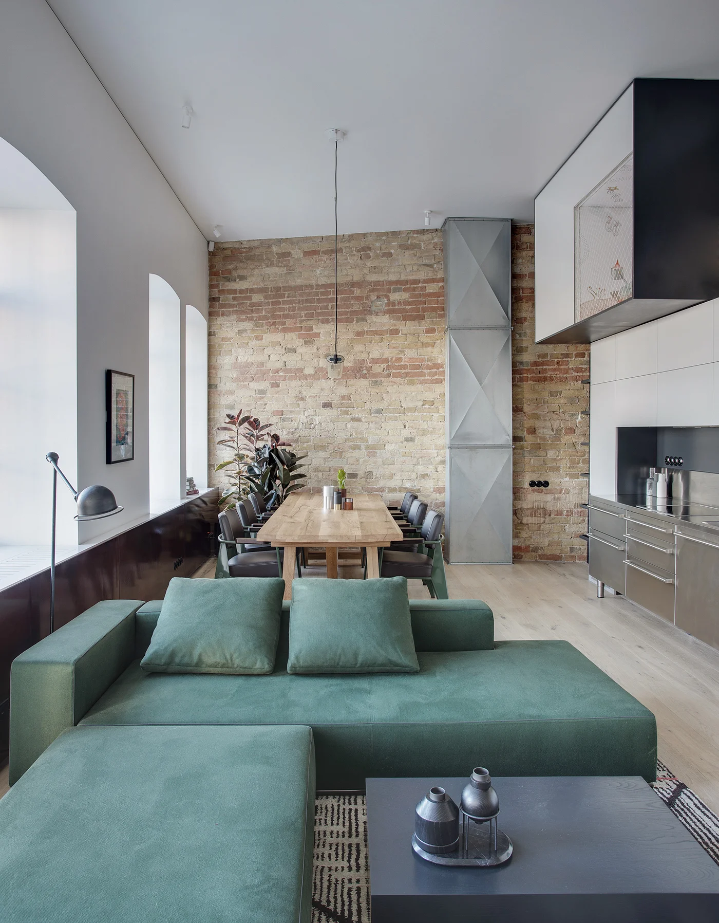 The modern shapes of minimalistic style are obvious – straight lines, cubic forms, angles everywhere. But the modernism is softened by the original arches of the recessed windows left intact; the curves of a vintage-style upright piano; the roundness of the light fixtures. The original brickwork, left exposed in the living room, is in harmony with the chrome of the modern kitchen. The heavy earthy colors of partitions and furniture bring out the bubbly lightness of the artwork in the kid’s space upstairs.