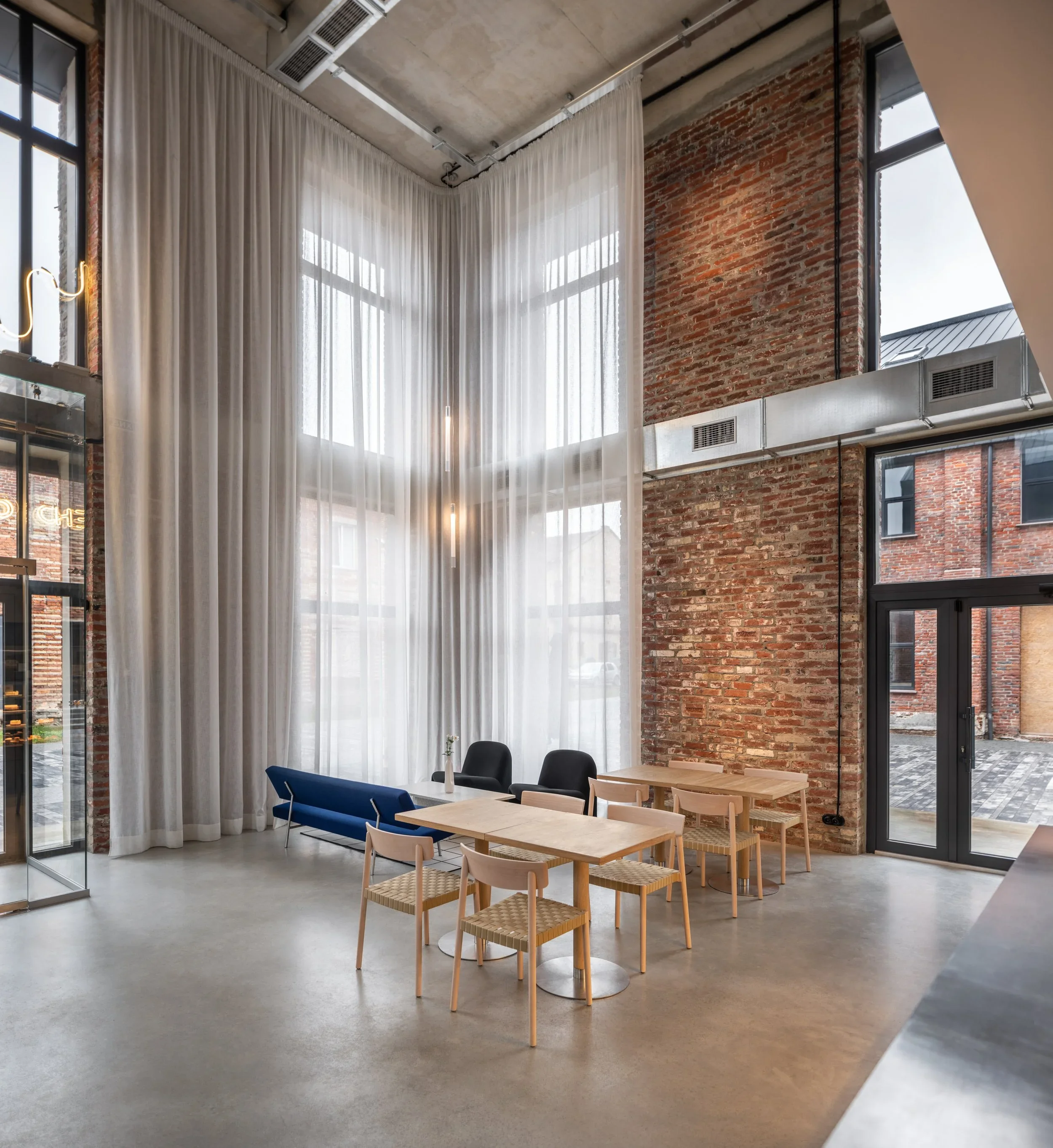 Cheese Bakery is a café and patisserie in Lviv, located in a revitalized industrial area. Our challenge was to integrate the new venue into the space of a former factory while reflecting the signature style of Cheese Bakery. The concept behind the café was to create a future gallery - the interior was designed as a calm, neutral backdrop for rotating exhibitions of local art.