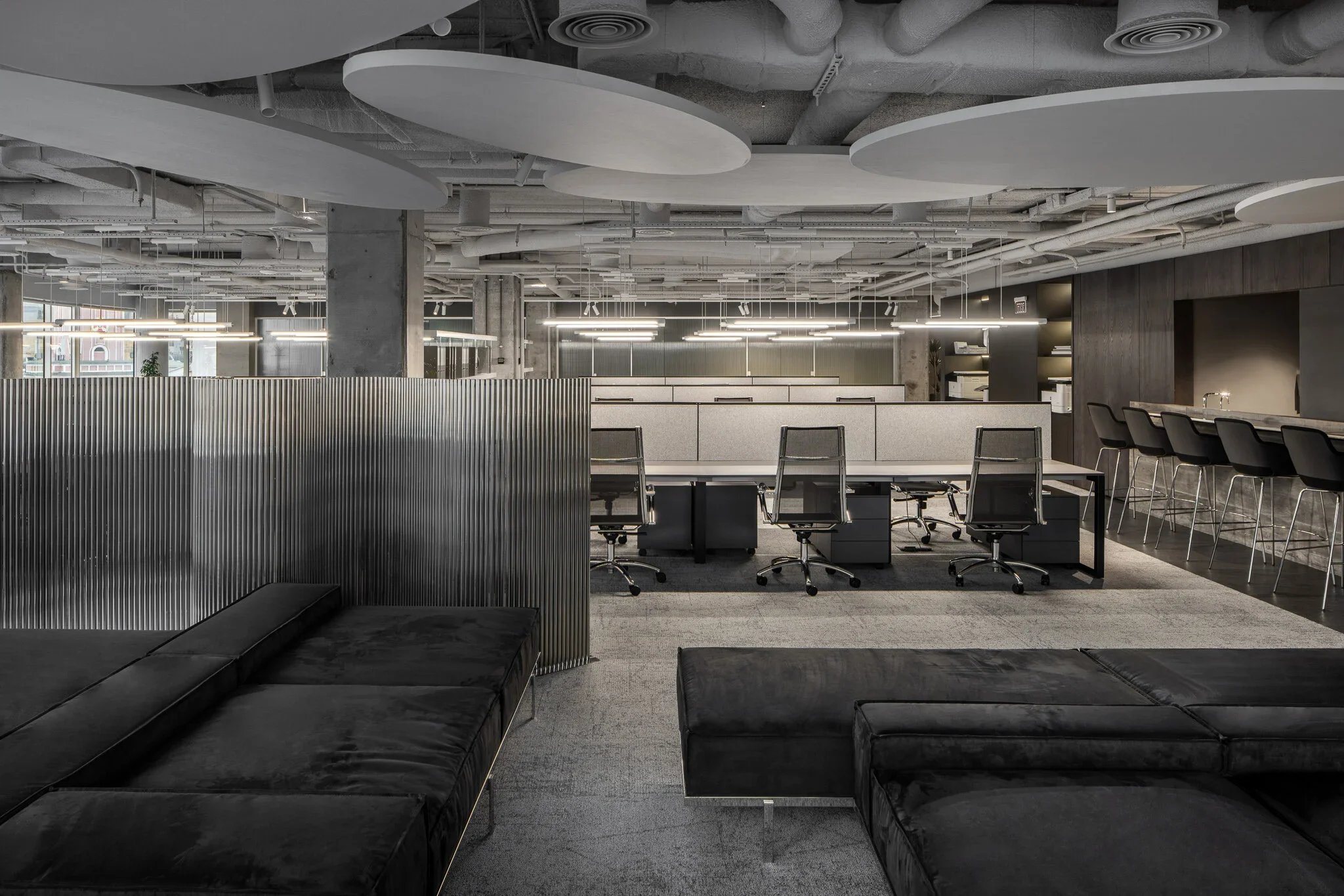 Vol12 is a corporate office in the center of Kyiv, designed for a team of 30 employees. The main goal was to combine functionality, acoustics, and understated aesthetics. The space features a monochromatic palette with natural materials – concrete, wood, and metal. The central element of the interior is a functional cube housing the kitchen, utility rooms, and restrooms, around which the work areas, lounge, and meeting rooms are organized. An open ceiling, satin-finished metal, graphite concrete surfaces, and warm lighting create an atmosphere of focus and comfort. This office has become a space where design fosters simplicity, efficiency, and a calm working rhythm.