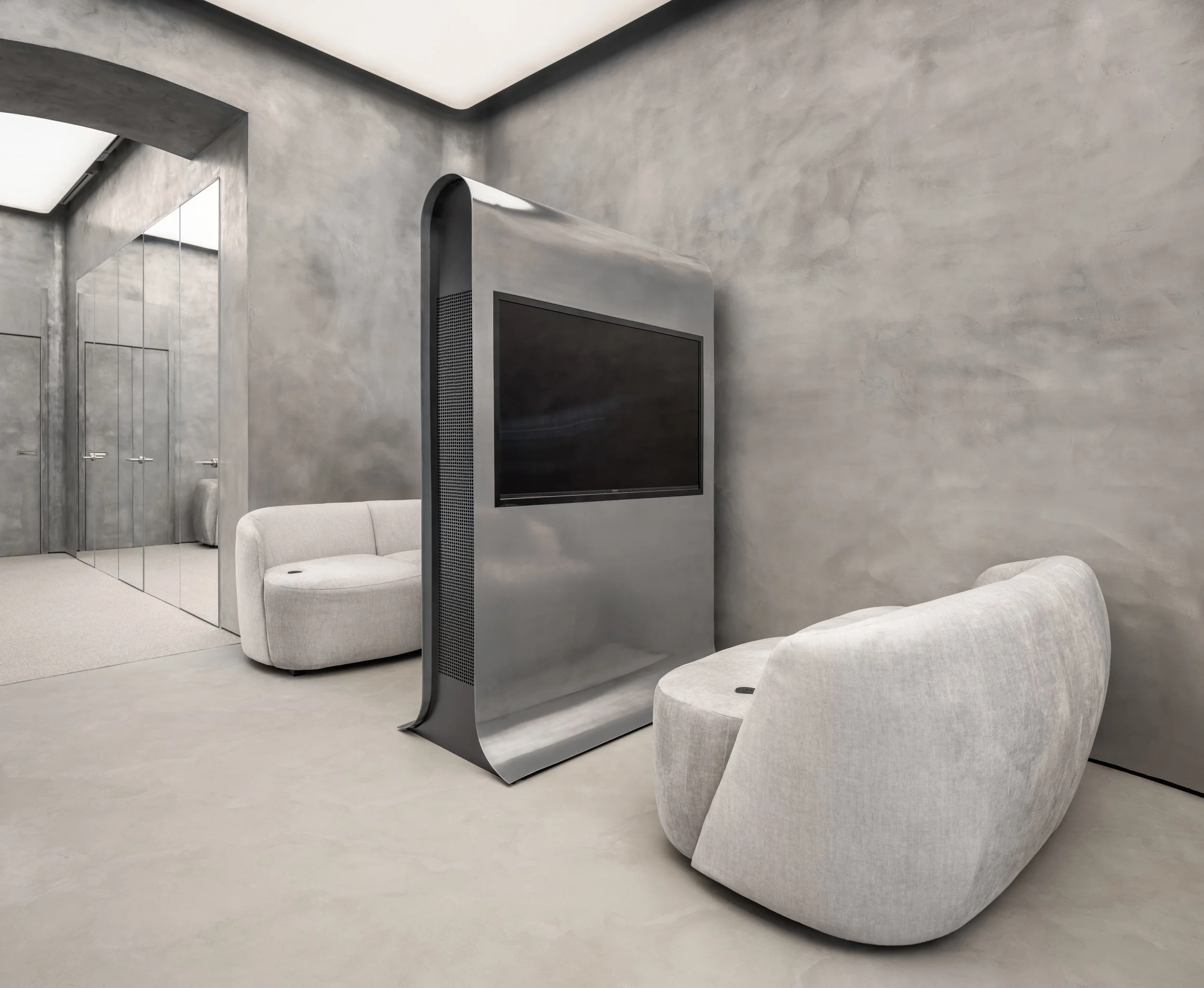Symbol – перший діджитал-шоурум мережі бутиків, розташований у Києві. Простір без рейлів та вішаків, де образи обирають на інтерактивних екранах, а речі приміряють офлайн. Ми створили інтер’єр з хвилястими стінами, мікроцементом, кастомними меблями та лайтбоксом на стелі. Сенсорні панелі вбудовані в столи, а світло реагує на рух. У нашому портфоліо шоурум став зразком функціональності, естетики й нової взаємодії з одягом.