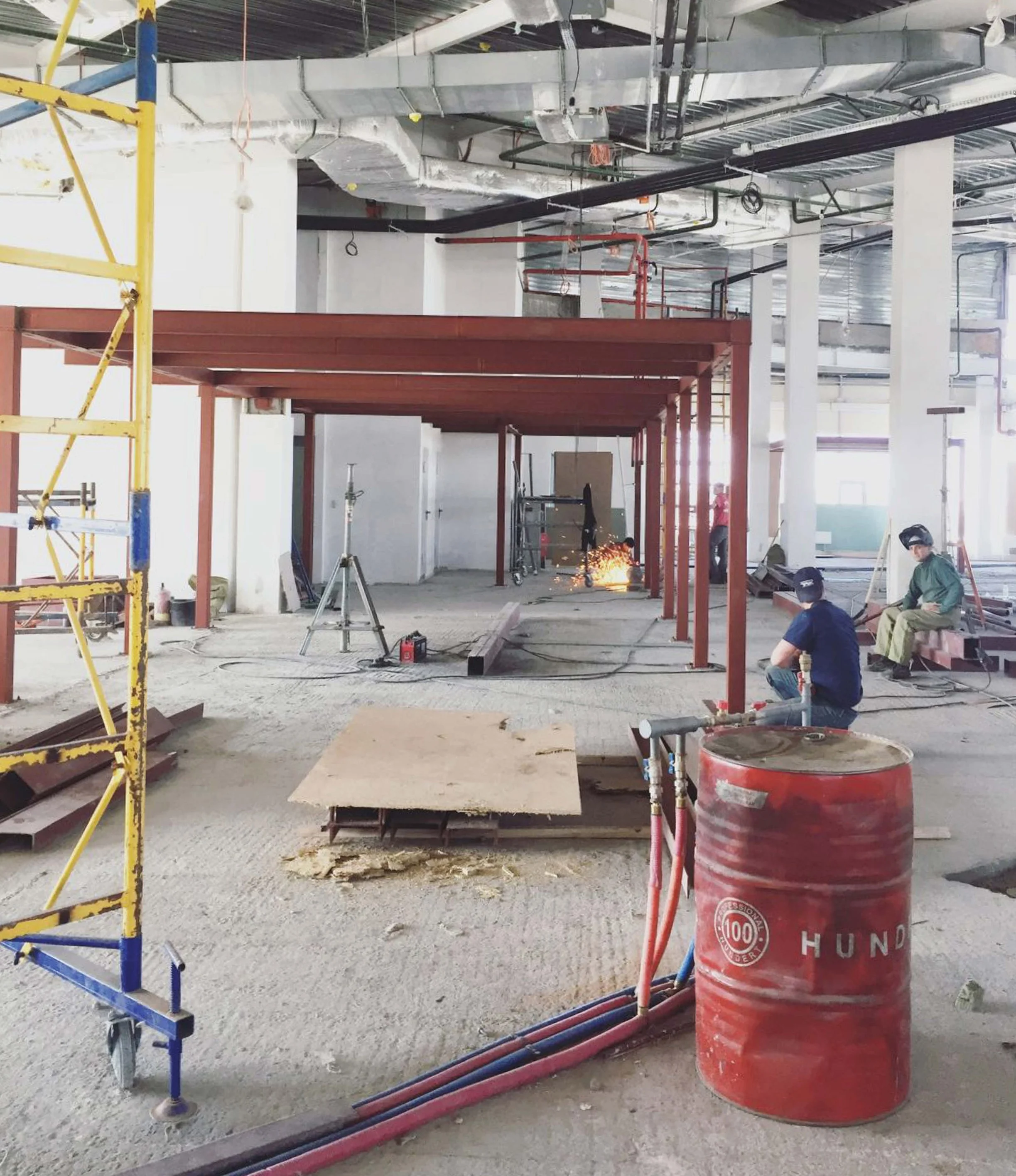 Fifty tons of metal was used in the construction of the office, out of which 25 tons went to making the suspension bridge. It has no ground support and is merely suspended from the ceiling. In order to keep the thickness of the bridge to a minimum, we passed the sprinkler system pipes under the main floor, and incorporated their fragments into the body of the bridge, blending them with the bridge’s structural elements.