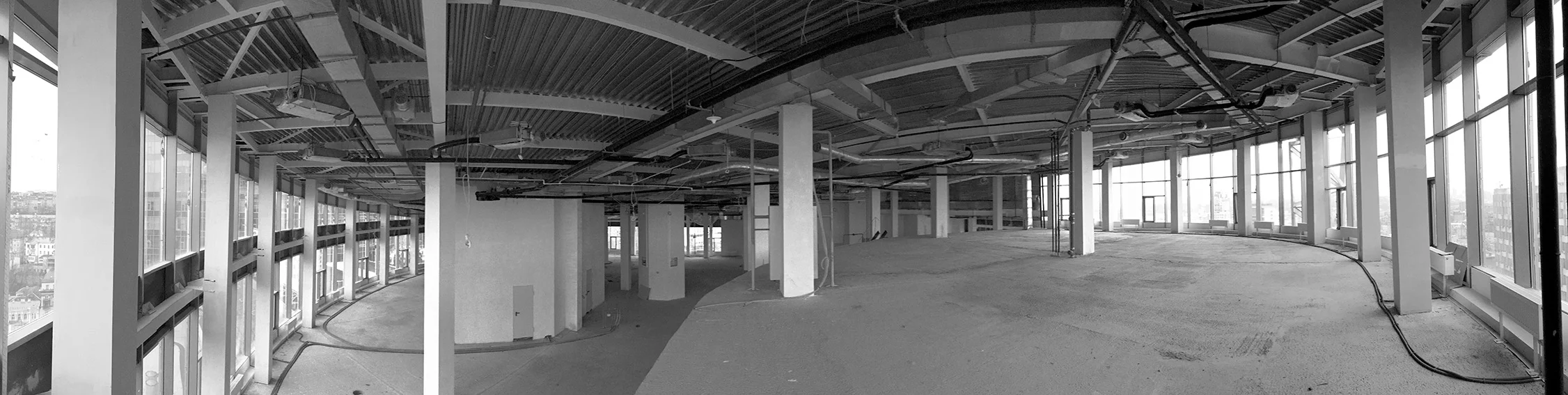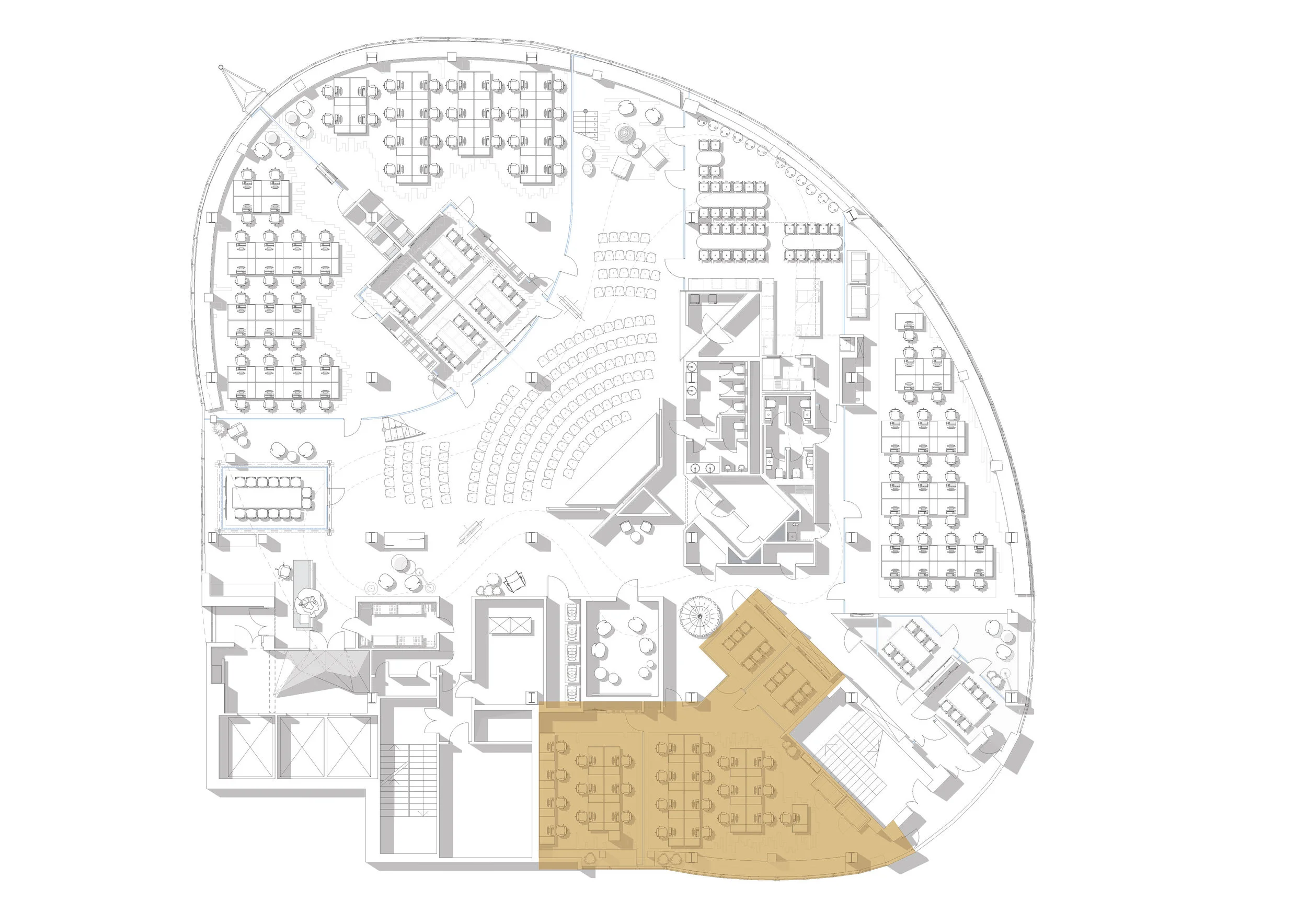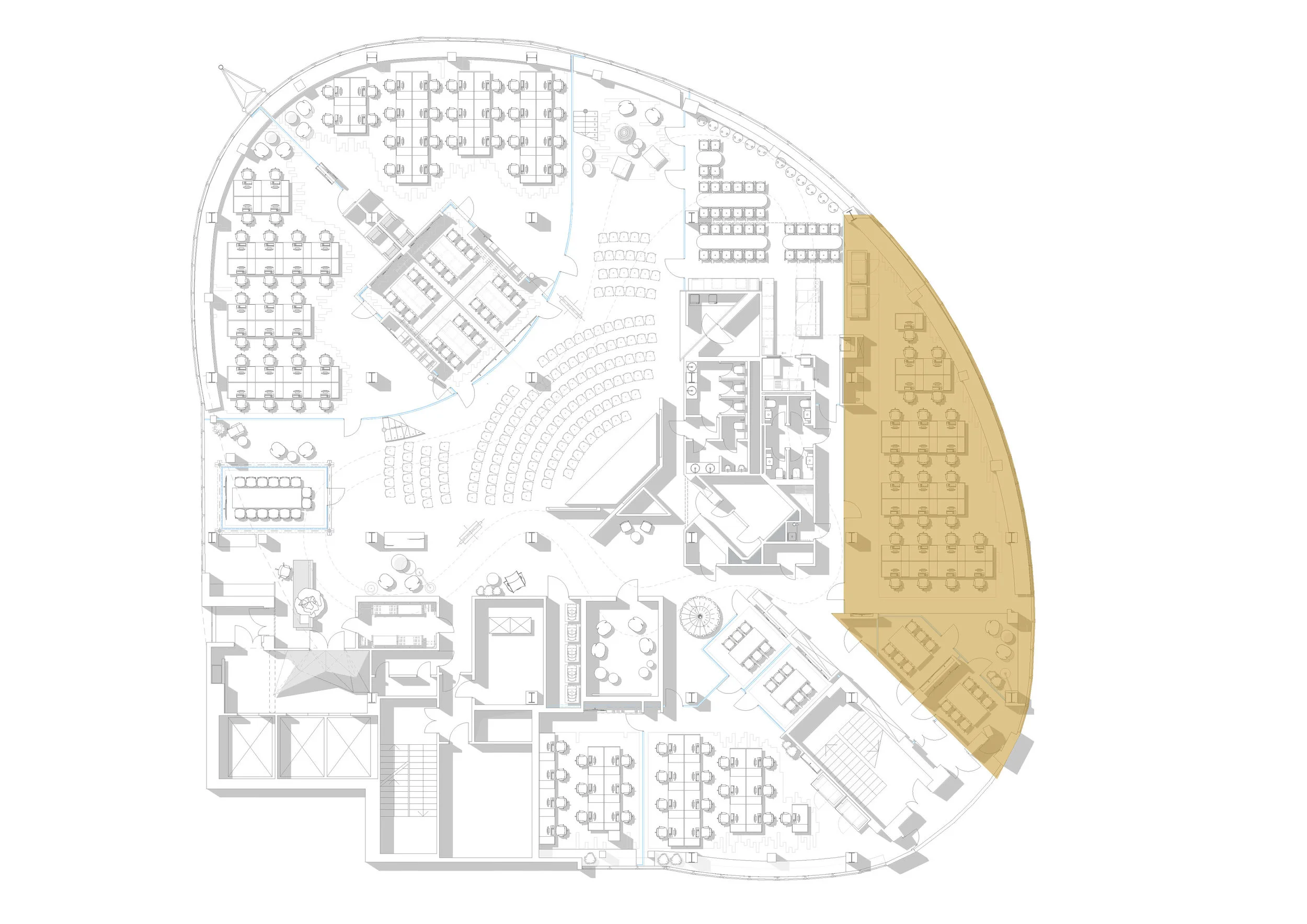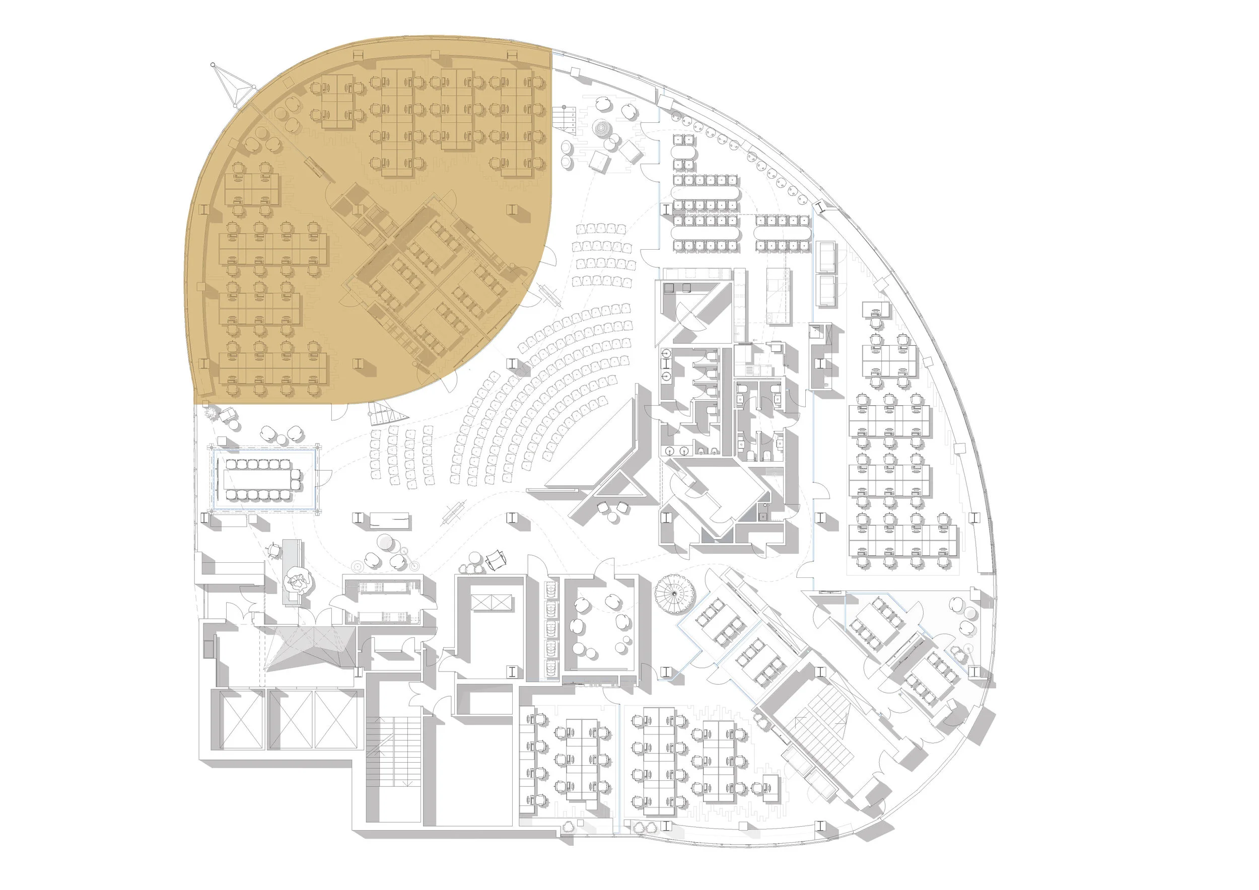 Офіс займає останній поверх бізнес-центру площею 1300 м2 та вбудований антресольний - близько 450 м2. Висота приміщень від 3-х до 8,8 м. Конфігурація верхнього рівня була відкоригована для забезпечення правильної радіальної кривої, що відгороджує робочі зони від мітап-зони. Добудований простір об’єднаний з основним поверхом двома новими відкритими сходовими маршами. На перекриттях приміщень першого поверху організовані лаунж-зони, об’єднані з робочими зонами підвісним мостом, замкненим в кільце.