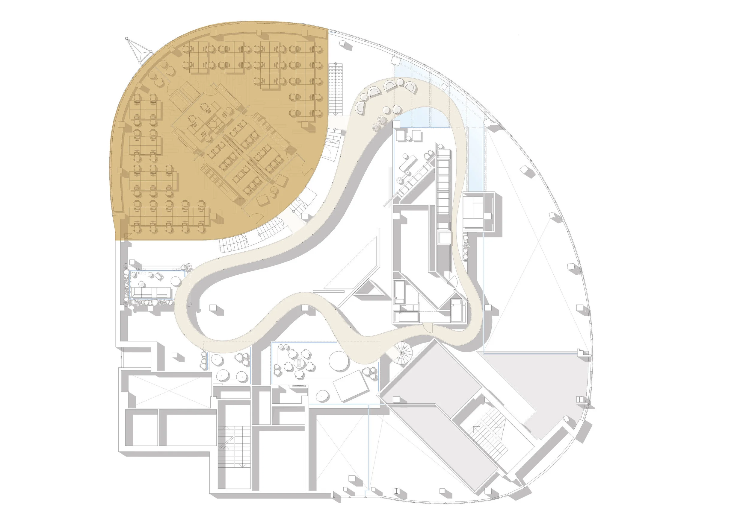Lounge areas created above the rooms of the ground floor are connected to the working zones by one of the key elements of the entire office - the suspension bridge. The length of the bridge is 90m, it loops around the office in a gentle curve, overlooking the entire office and expanding slightly to accommodate lounge zones in its path. It unites various functional zones of the office into a single life cycle; it has also become a powerful symbol of the inseparable connection between Grammarly offices in San Francisco, New York and Kyiv.
