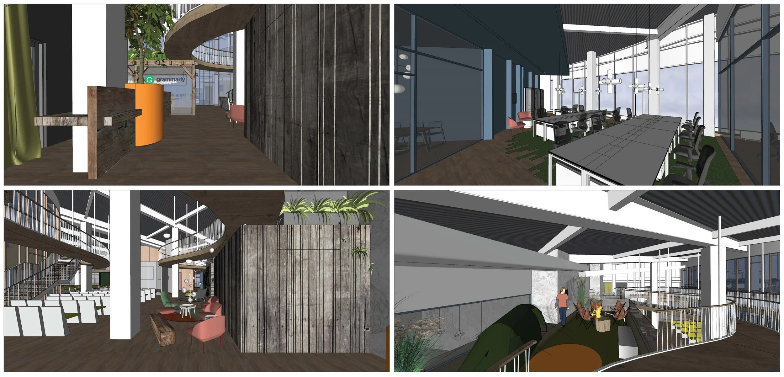 Також, для підтримання високого рівня комфорту працівників та їх продуктивності були необхідними використання екологічно чистих матеріалів та теплих відтінків, щоб створити домашній затишок у офісі. За рахунок застосування натурального дуба в інтер’єрі, мотивів відкритого простору та великої кількості природного світла, працівники мають змогу відпочити у середовищі, наближеному до навколишнього.