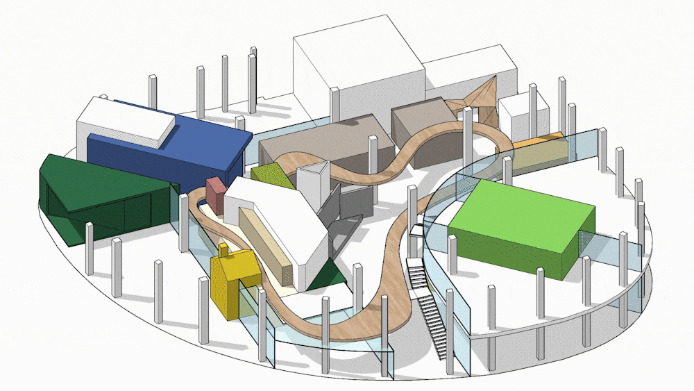 Столи, що знаходяться в чотирьох жовтих переговорних кімнатах, трансформуються в один. Таким чином, окремі приміщення для переговорів можна об’єднати в єдиний загальний простір.