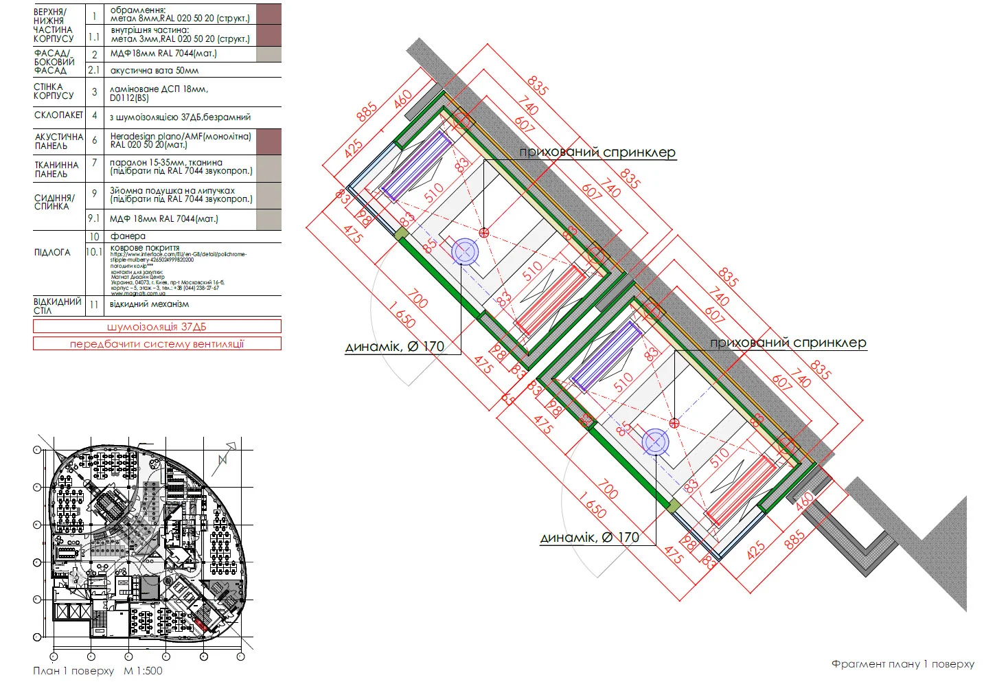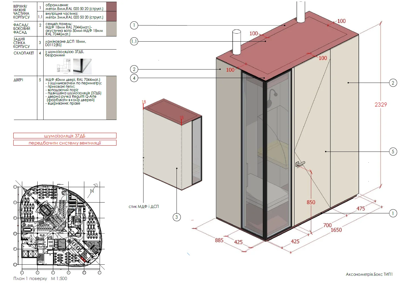 Спеціально для клієнта розроблений Skype-booth- автономне звукоізольоване приміщення для приватних розмов зі світло-прозорим кутом та чіткою геометрією на дві людини, де встановлено відкидний столик та світильник. Всередині юніт обшитий звукопоглинаючими тканинними панелями, має систему вентиляції та кондиціонування по датчику CO2, протипожежні системи, підключені через фальш-підлогу. Skype-booth розміщений в усіх робочих зонах.