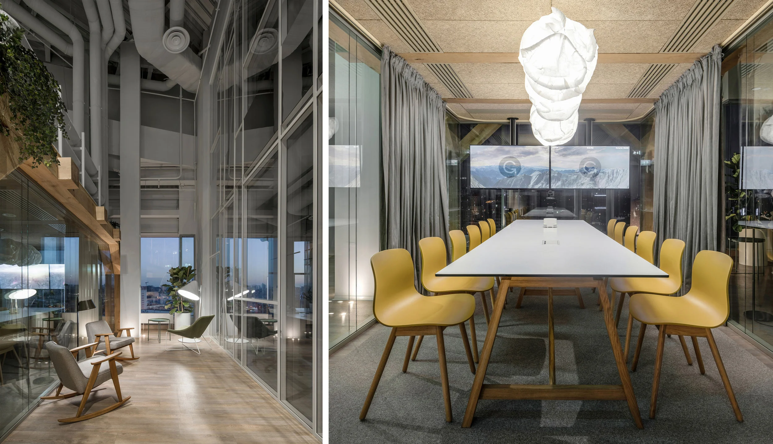 Our layout idea was to split the office area into six open-plan working spaces, each with soundproof qualities and finished in different colors. Within each workplace, there are two meeting rooms with capacities of 8 to 15 people.
