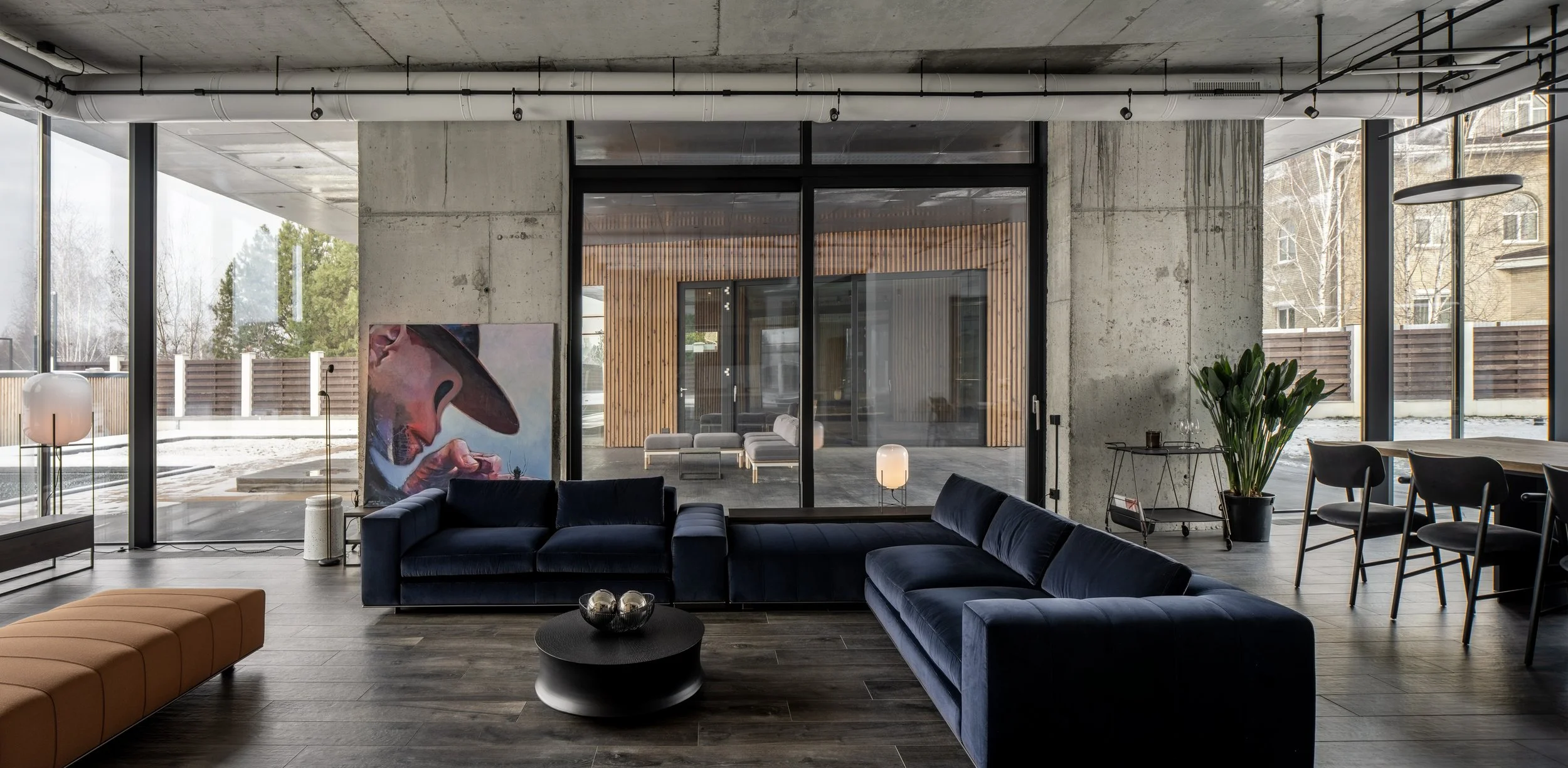 Аби зберегти візуальний зв’язок із природою і всередині будинку, ми вирішили не переобтяжувати інтер’єр яскравими кольорами та масивними конструкціями. Відкритий бетон слугує нейтральним фоном, а внутрішні скляні перегородки додають будинку легкості та прозорості. В інтер’єрі переважають природні відтінки, які перегукуються з пейзажем за вікном: сірий, теракотовий, зелений, темно-синій, білий та чорний.