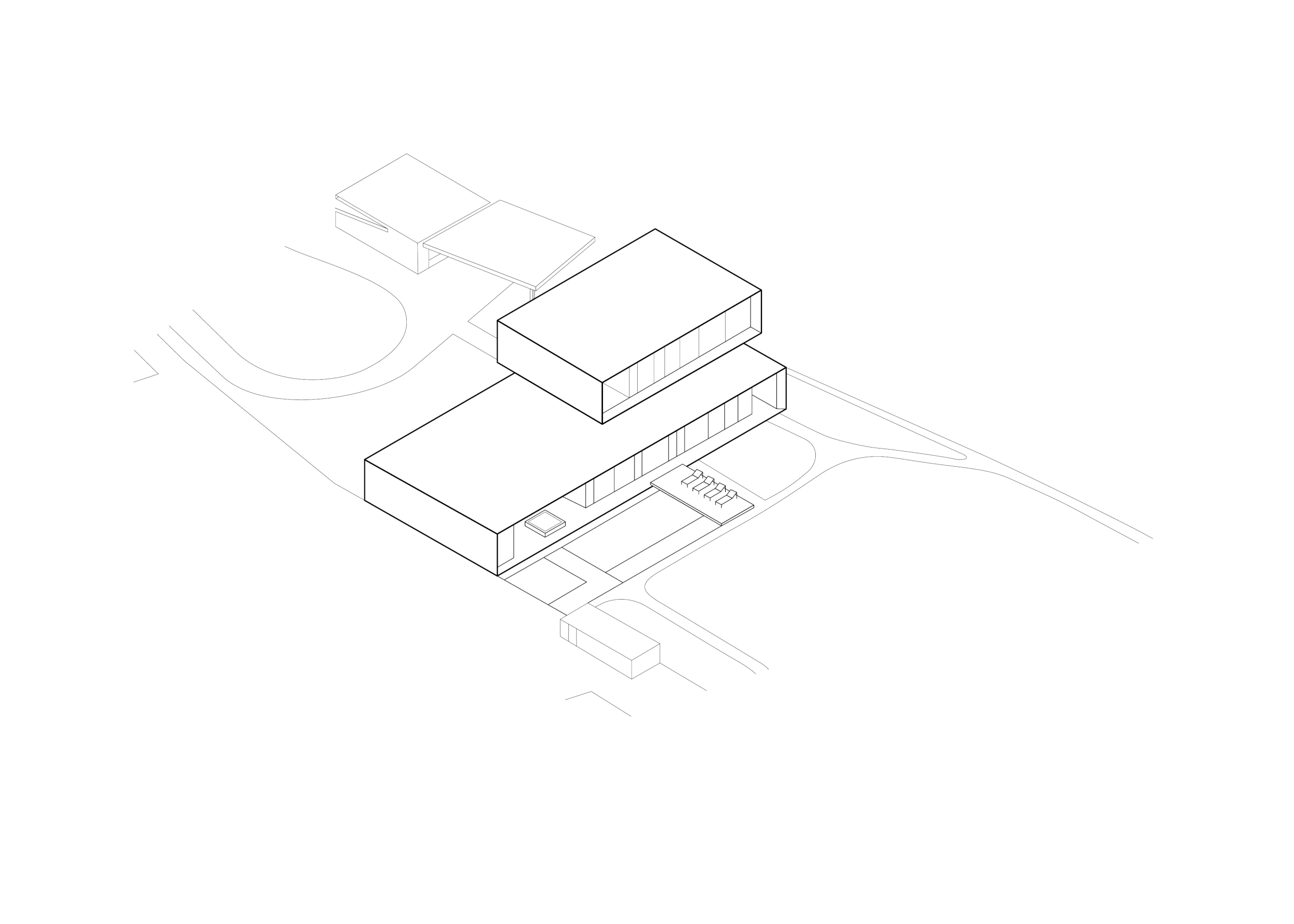 Будинок формально розбитий на три об’єми, два з яких перебувають у постійній динаміці: другий поверх нібито ковзає поверхнею першого. Для досягнення такого ефекту великогабаритні блоки треба було візуально полегшити. Якщо розглядати будівлю здалека, здається, що другий поверх перебуває в невагомості в оточенні чотирьох вікових сосен.