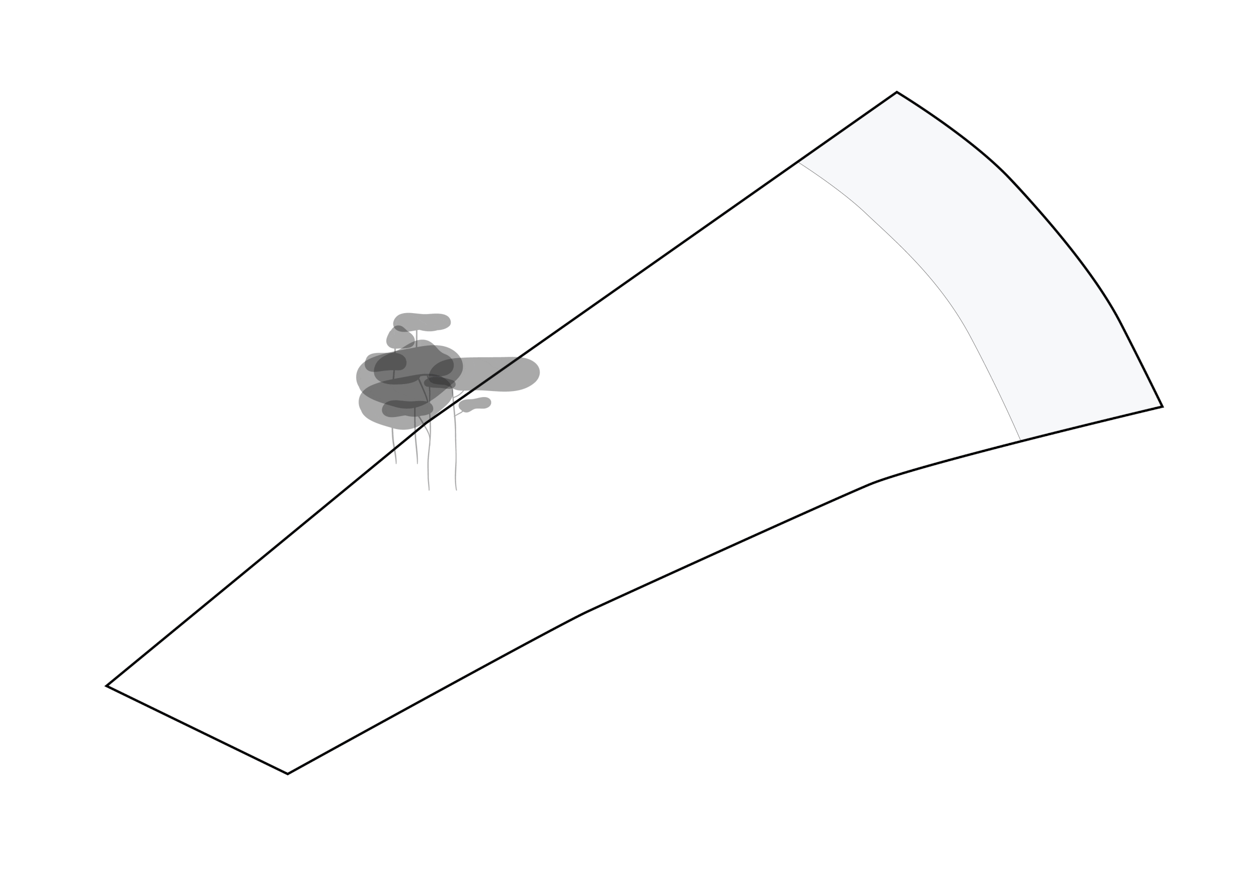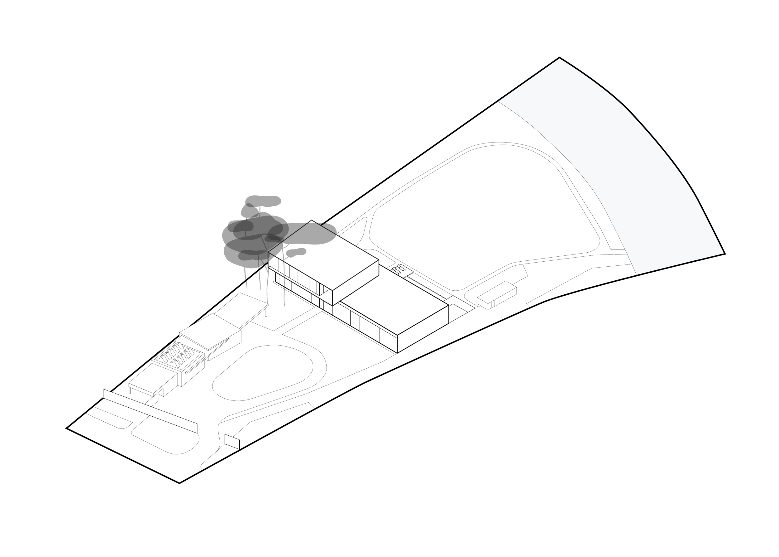 Ділянка на березі річки Козинки має форму видовженої трапеції, яка розкривається в напрямку води. Щоб раціонально зонувати цей простір і максимально взаємодіяти з ландшафтом, ми запропонували розмістити головний будинок паралельно до річки. Будівля, розташована впоперек ділянки, ділить її на дві частини: