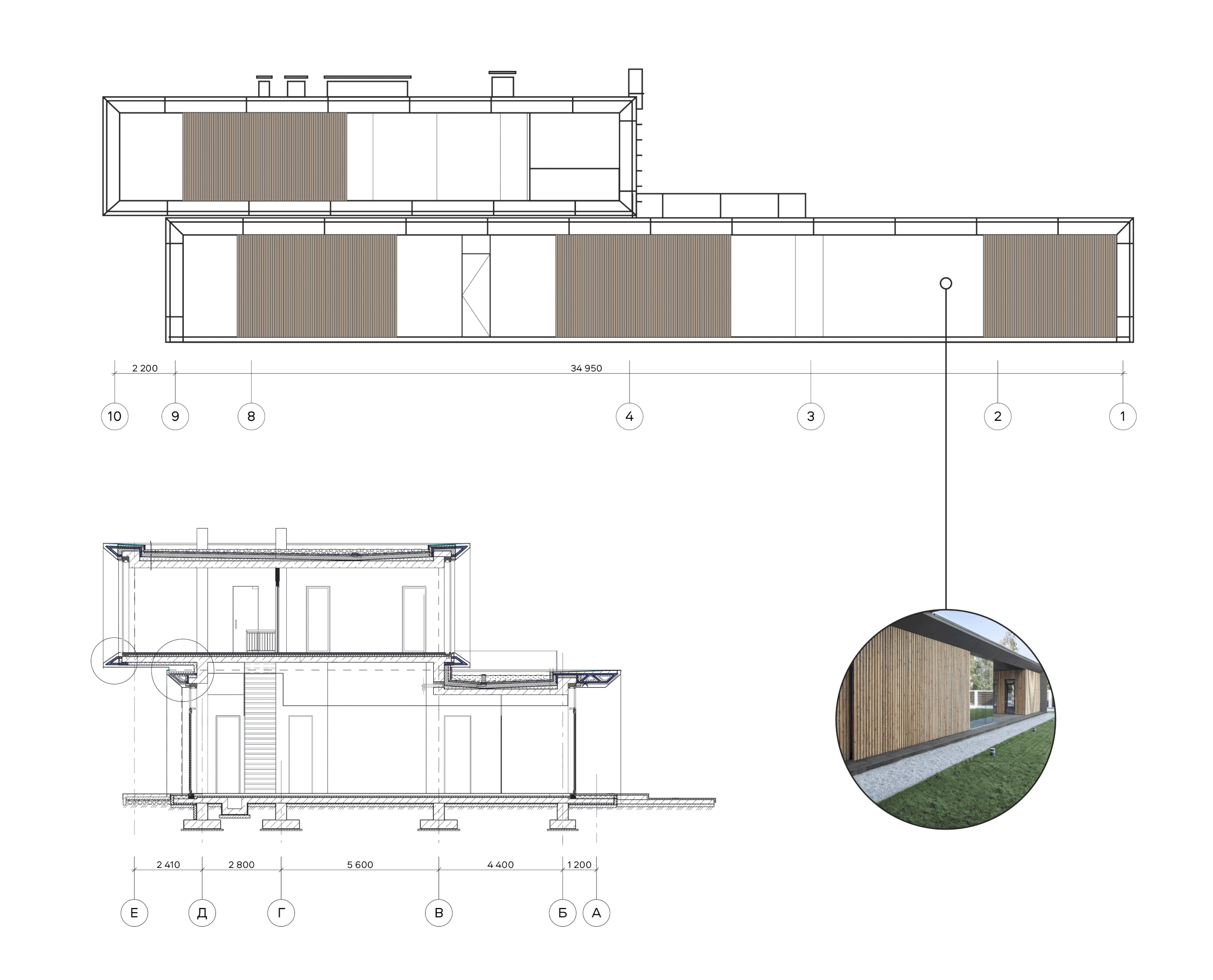The ventilated facade of the two-story house is made of thermowood cladding and hinged fiber-cement panels mounted on an aluminum framework. Most of the facade consists of structural glazing on concealed aluminum profiles. Glazing height measures in at 3.75 m on the first floor and 3.25 m on the second. The parapets and vertical elements on the sides have a beveled trapezoidal shape; with this technique, we visually reduced the thickness of the outer walls. The doors are constructed using aluminum three-chamber profiles with thermal inserts and panels lined with copper sheets.