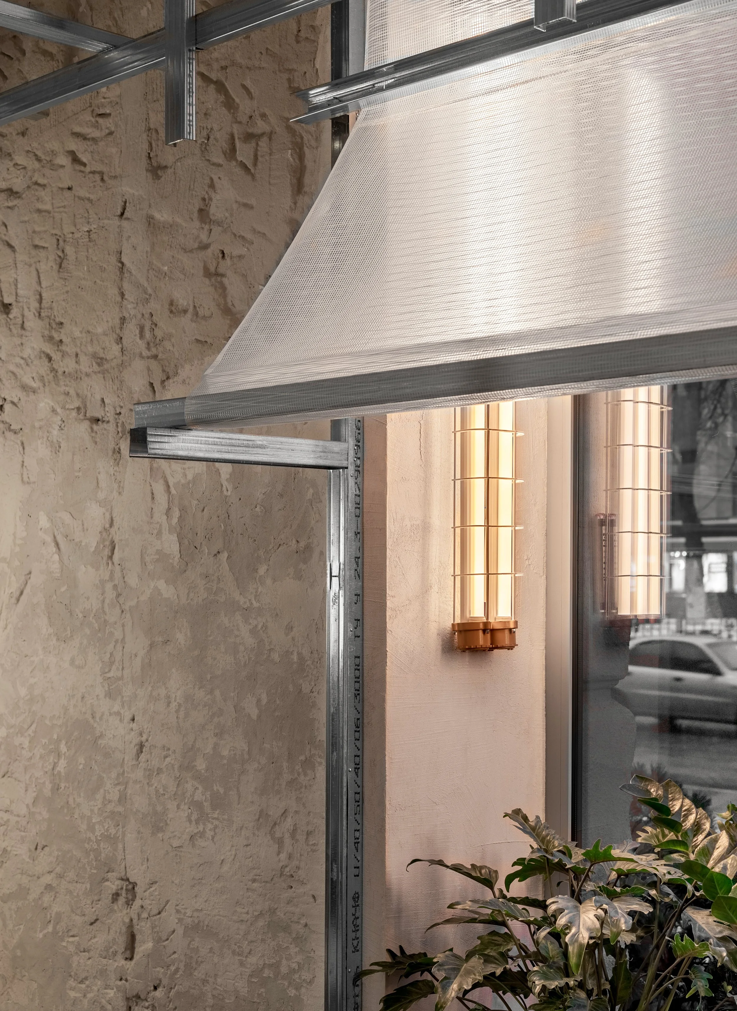 20 identical wall lamps were shipped in from China. During transportation, most of the glass on the lamps broke, so we had to improvise on the spot. The lamps’ armatures were left exposed with no glass casings and were supplemented with new bulbs with warm amber light.