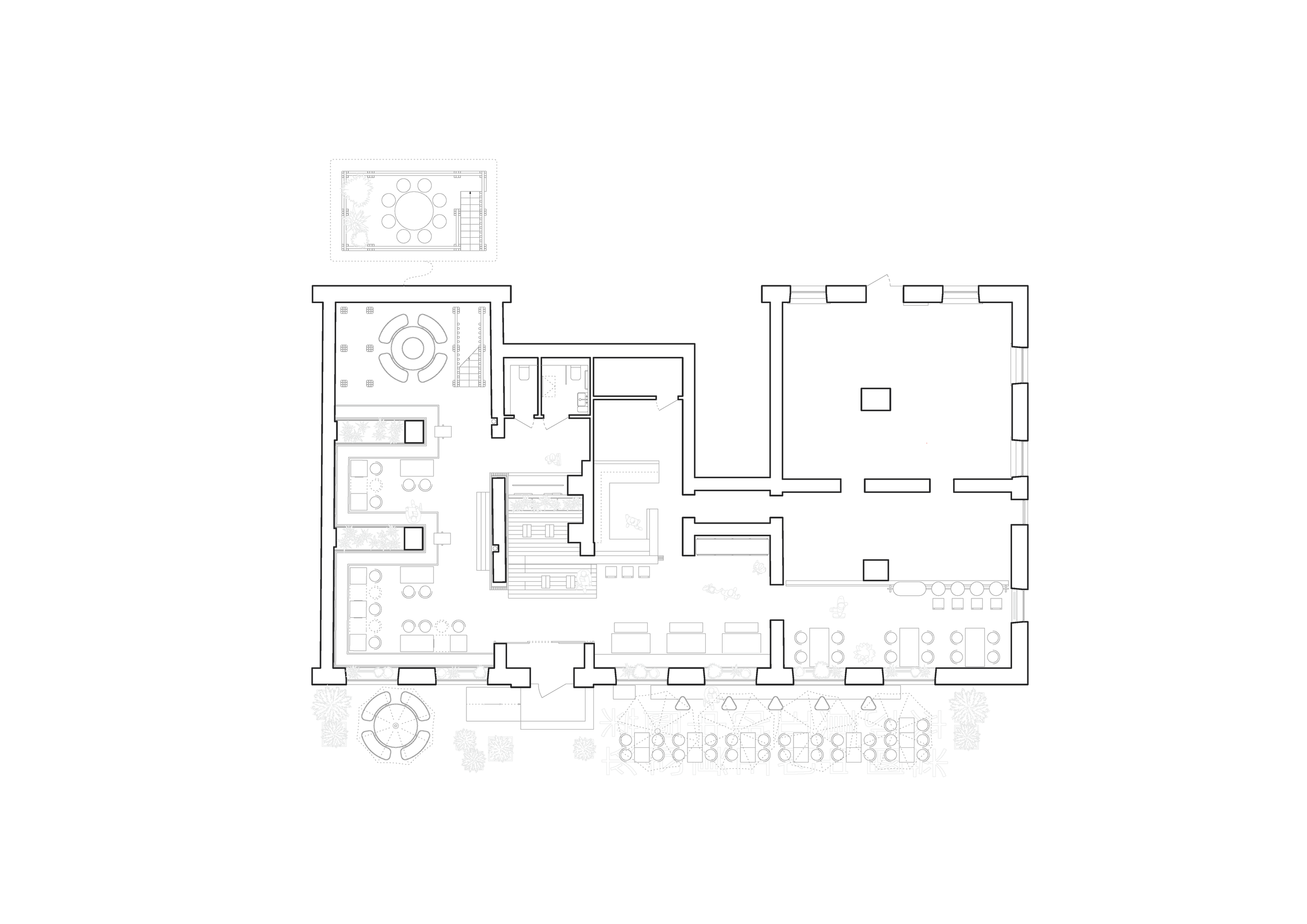 Серед зон, які просив запроєктувати власник, були відкрита кухня й зона take-away, де можна придбати азійські товари й оформити замовлення із собою. Крім того, замовник був відкритий до незвичних форматів посадки.