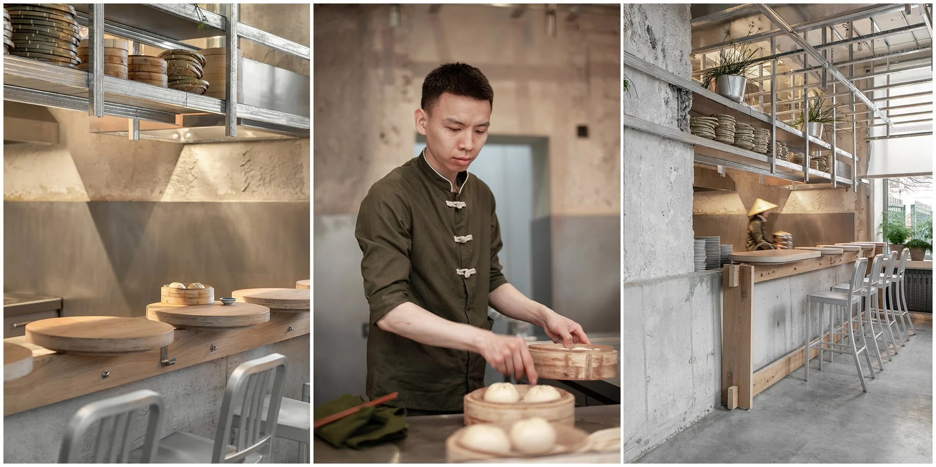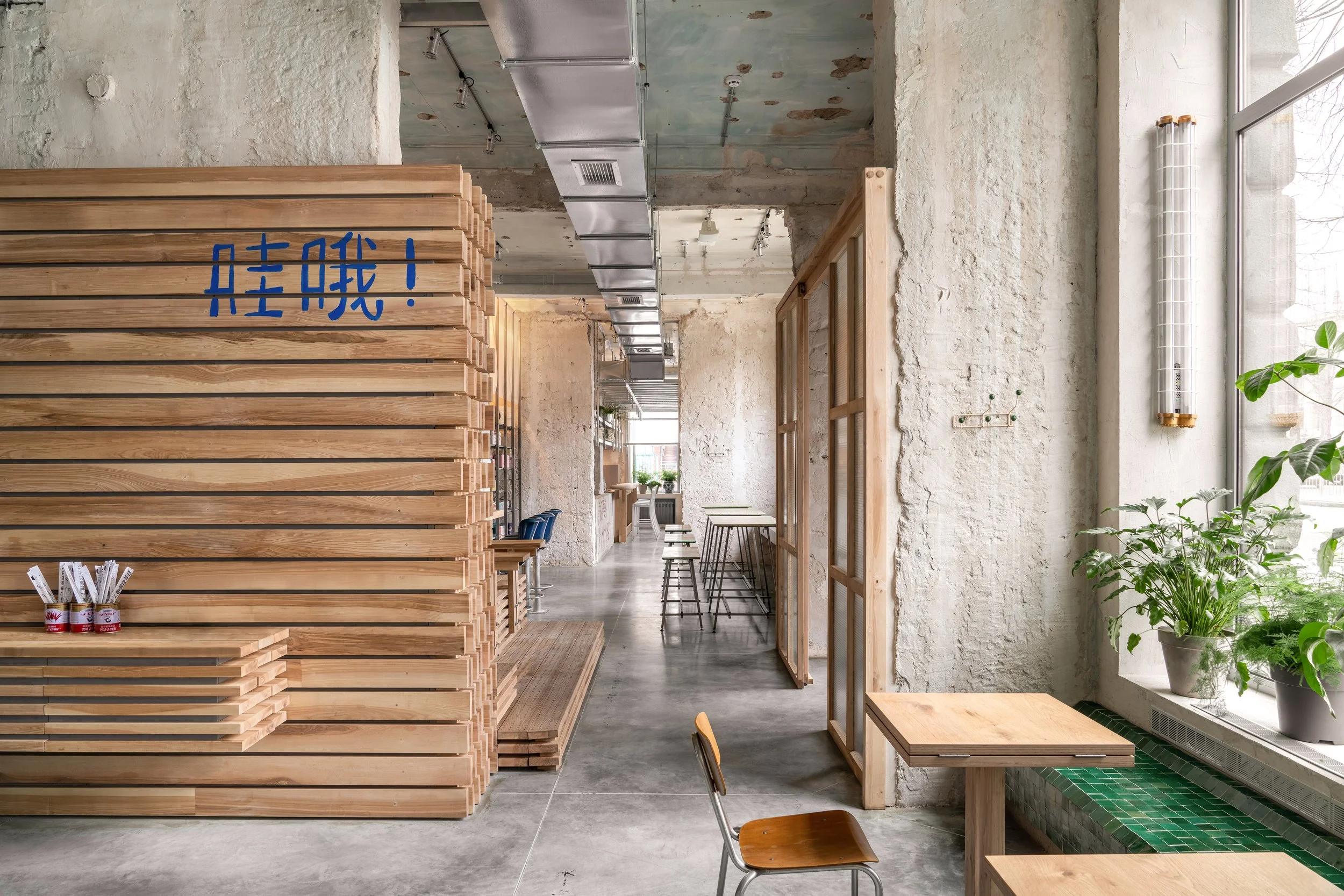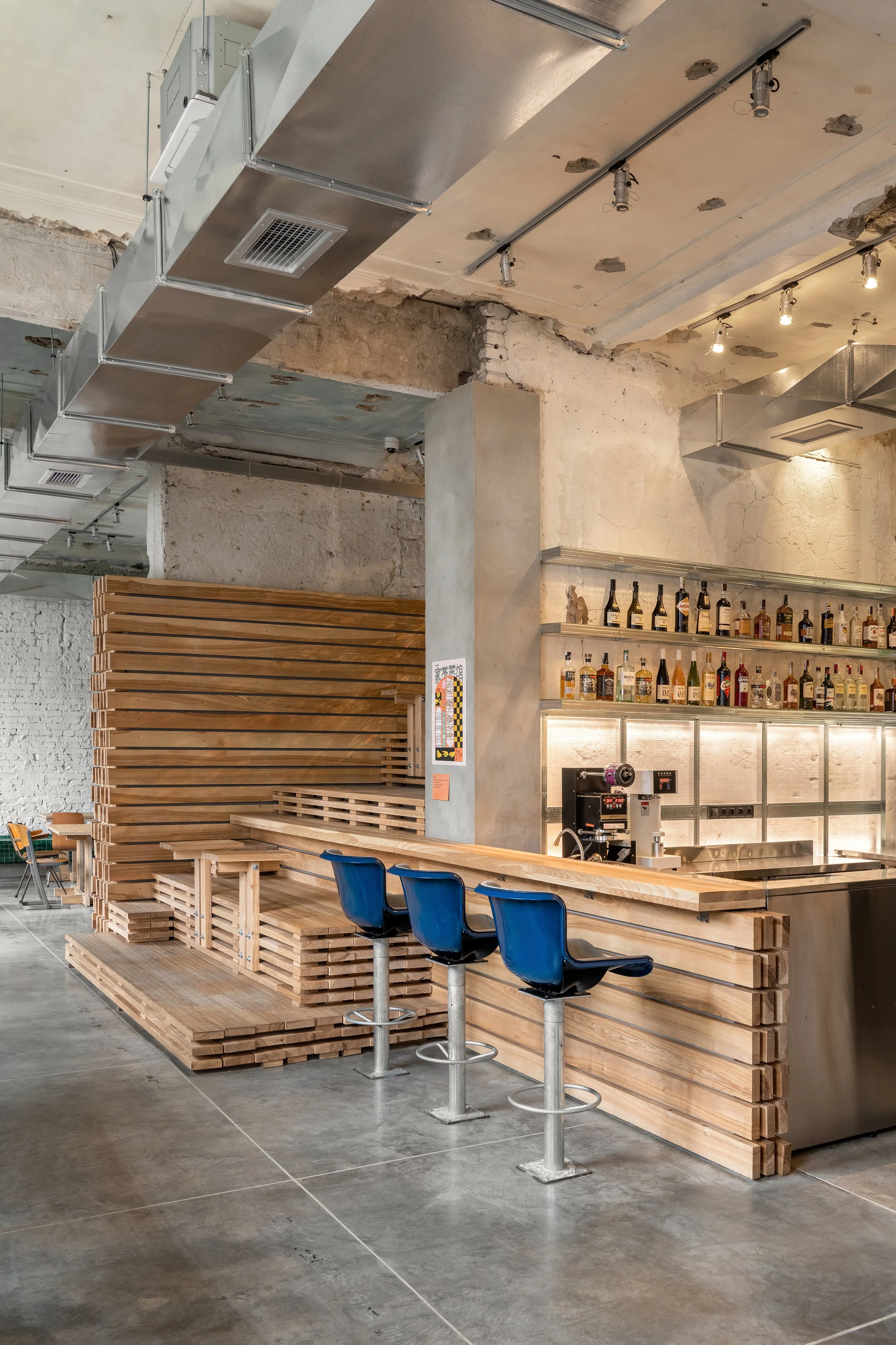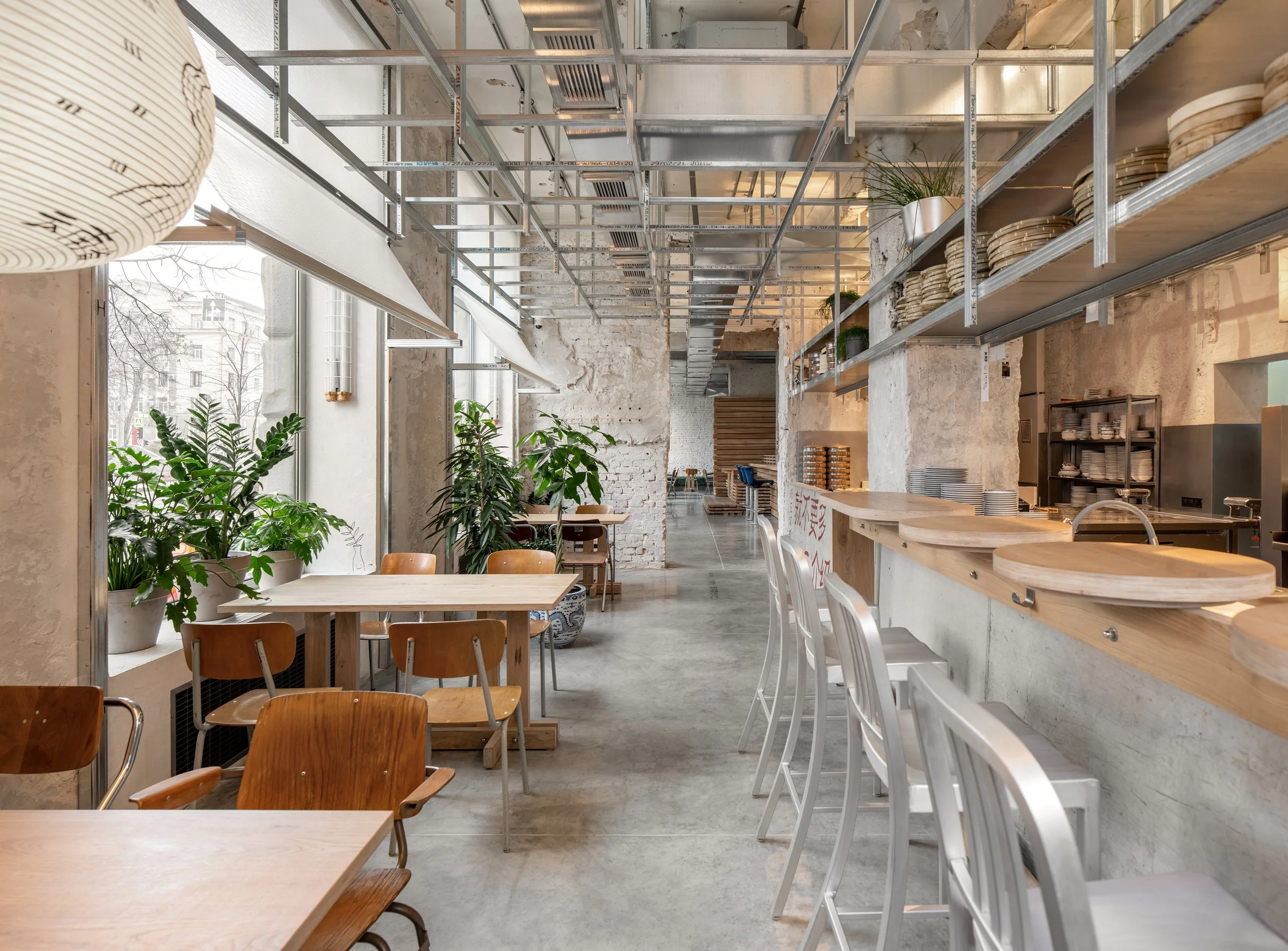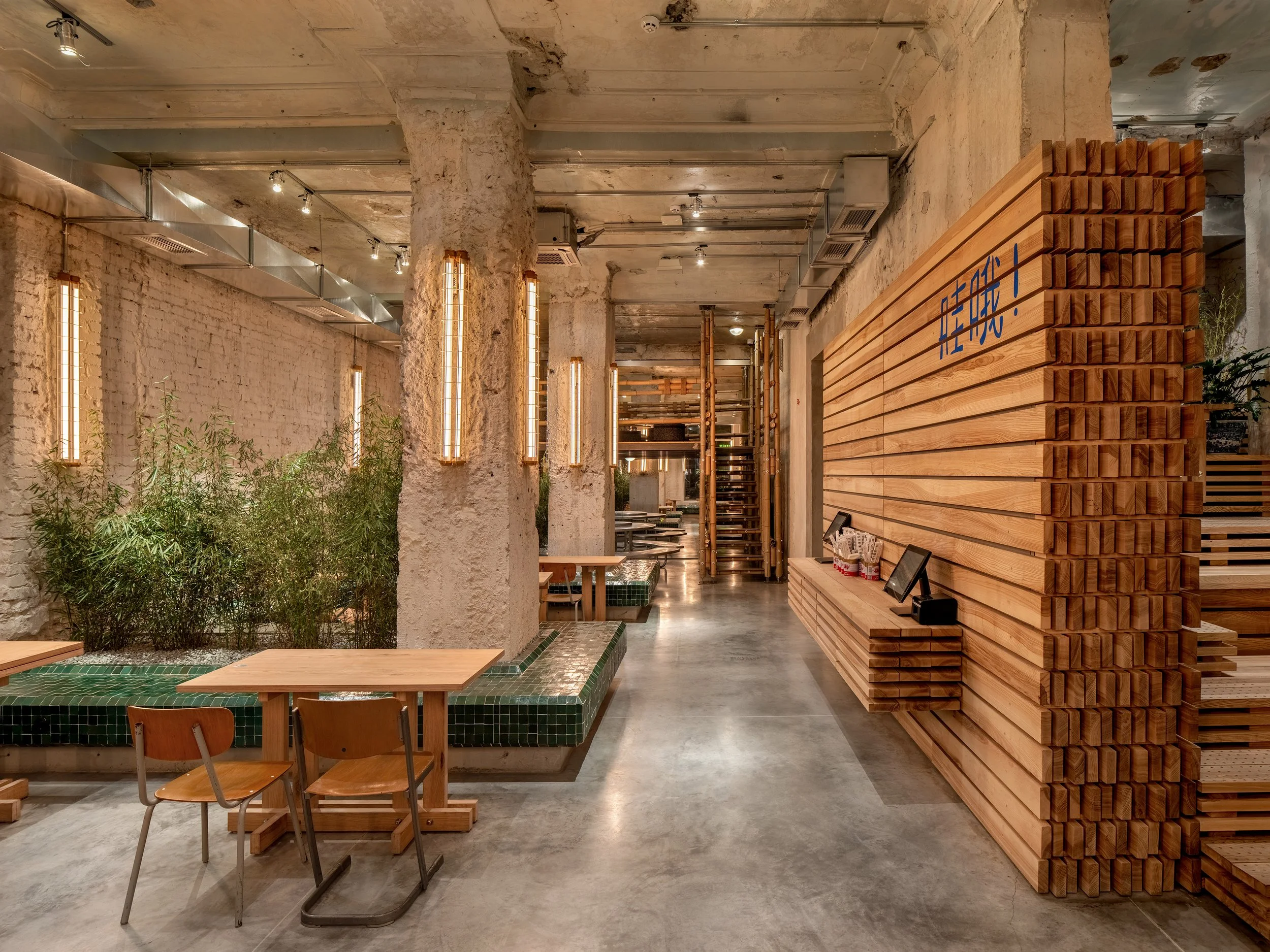 Ми прониклися легендою Мао та продовжили її в дизайн-концепції. В інтер’єрі закладу багато натяків на незавершений ремонт: відкритий гіпсокартон, необрамлені дзеркала, дерев’яні дошки, складені стосом, наче в будівельному гіпермаркеті. До будівельної естетики відсилає й бамбукова антресоль: риштування з бамбука в Китаї використовують навіть для конструювання хмарочосів.
