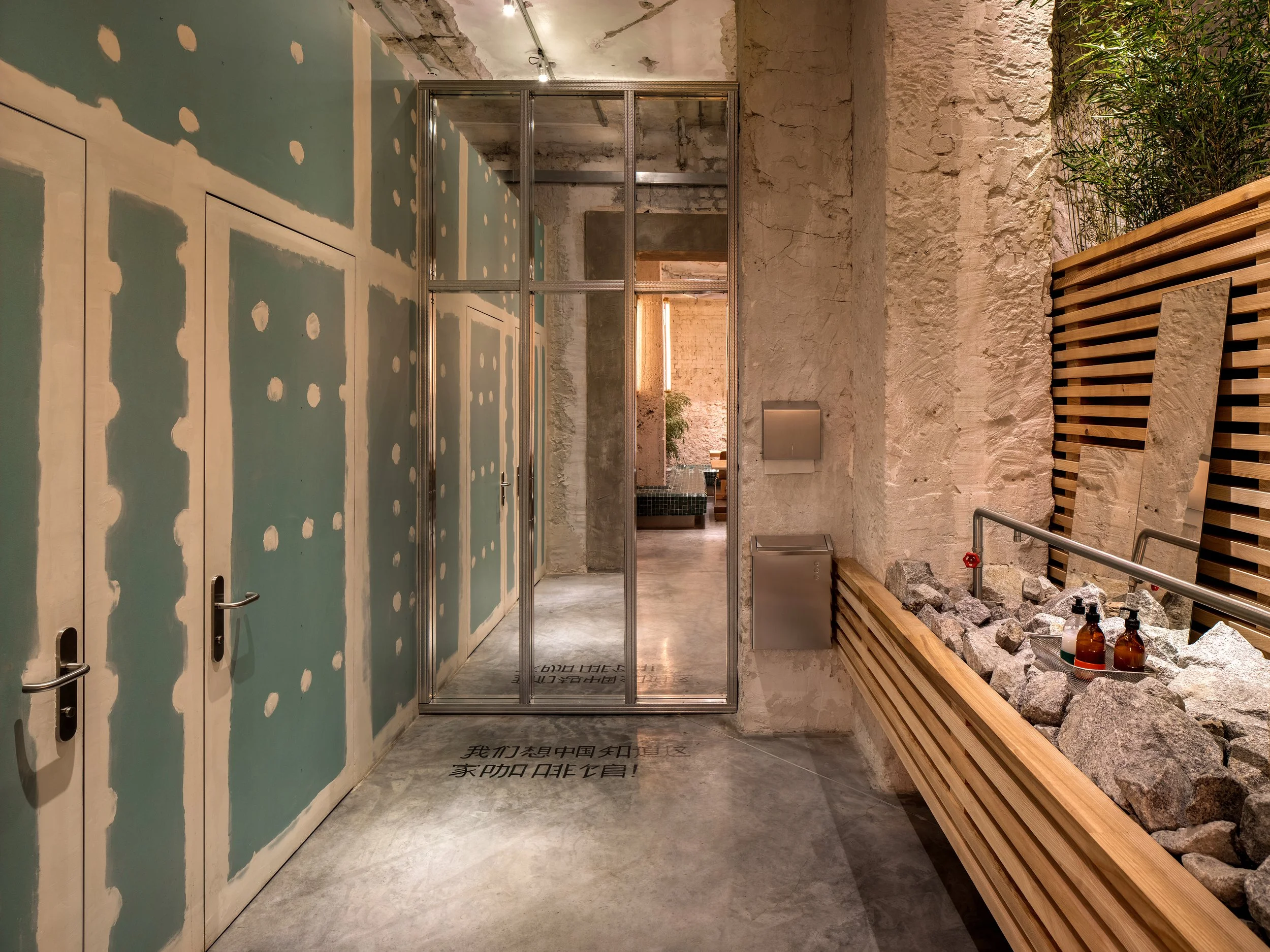 We fell in love with the legend of Mao and brought it with us into the design concept. There are many hints of unfinished DYI renovation in the interior: open plasterboard, unframed mirrors, wooden boards stacked in the fashion of construction hypermarkets. The bamboo mezzanine also refers to construction aesthetics: bamboo scaffolding is often used in China to construct buildings, and even skyscrapers.