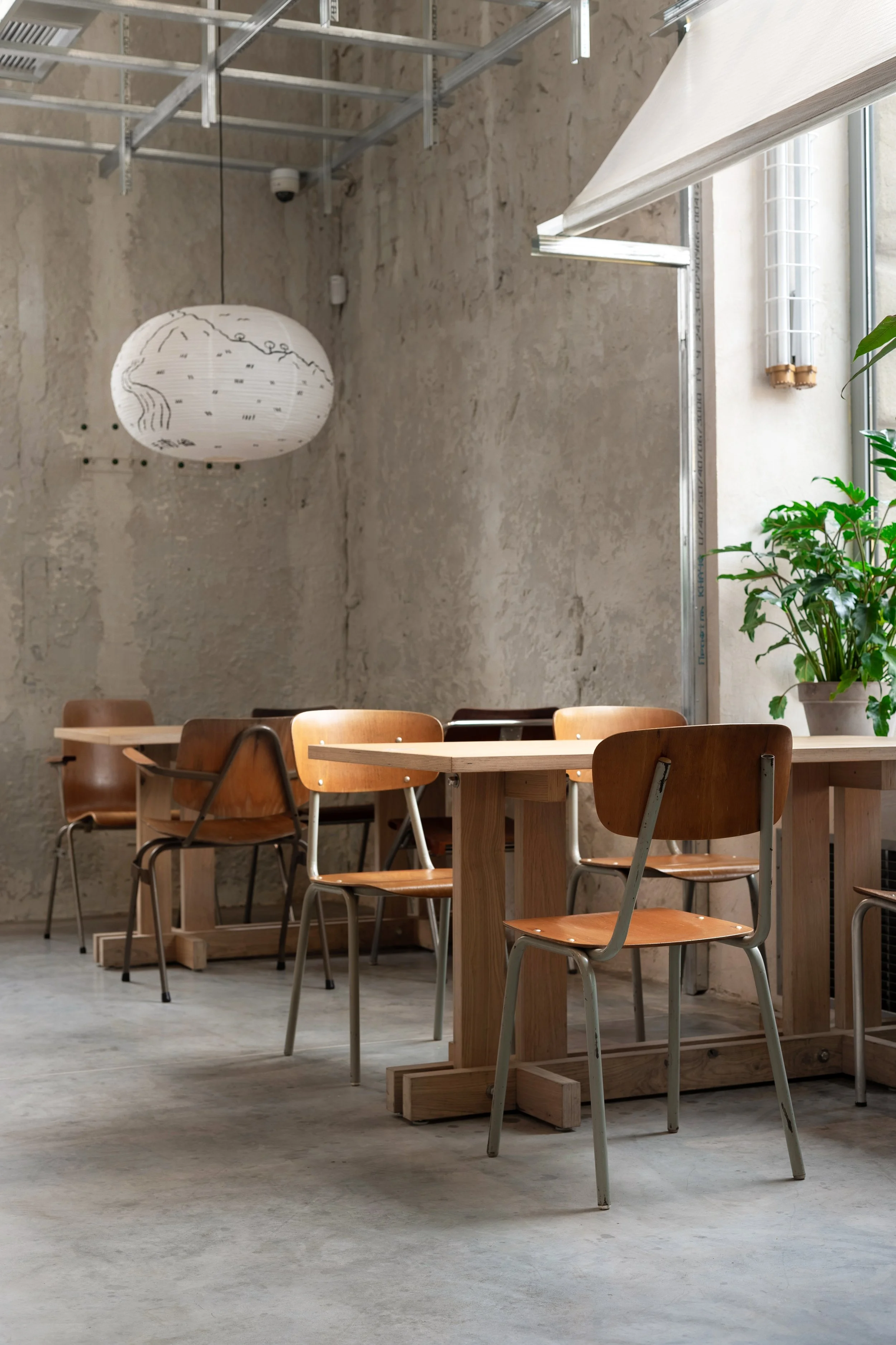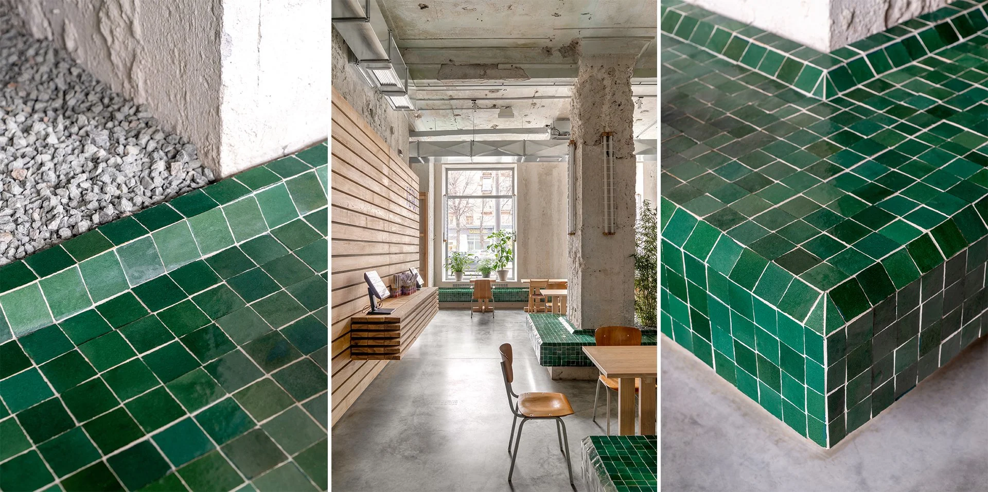 Ми вирішили пустити природу всередину: висадили живий бамбук, розставили кашпо з рослинами вздовж великих вікон і зонували простір за допомогою довгої зеленої лави. Підтримали концепцію дружніми до природи рішеннями, як-от меблями з переробленого пластику та маркізами із залишків парусини.