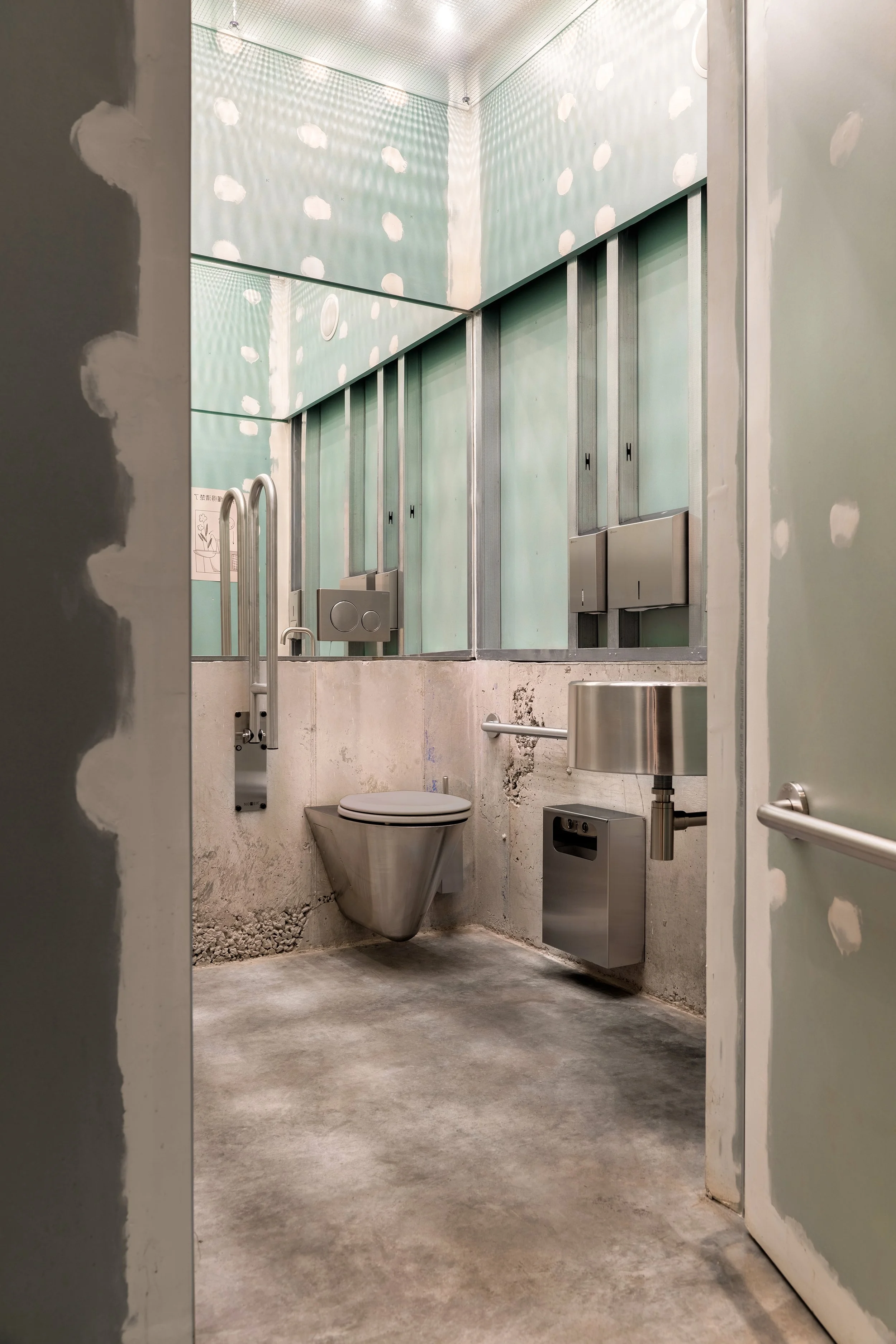 Всередині кабінок гіпсокартон тримає невелика, відлита в опалубці бетонна конструкція. На стінах можна розгледіти іронічні малюнки, написи китайською та інші «пасхалки» від ілюстраторки Мирослави Шевченко. Натхненням для такого декору стали нотатки, які будівельники часто залишають на стінах.Обидві кабінки (широка, для маломобільних груп, і менша) мають свої фішки. У першій це армоване скло з підсвіткою, крізь яке проглядається інсталяція унітаза, у другій – велике селфі-дзеркало.