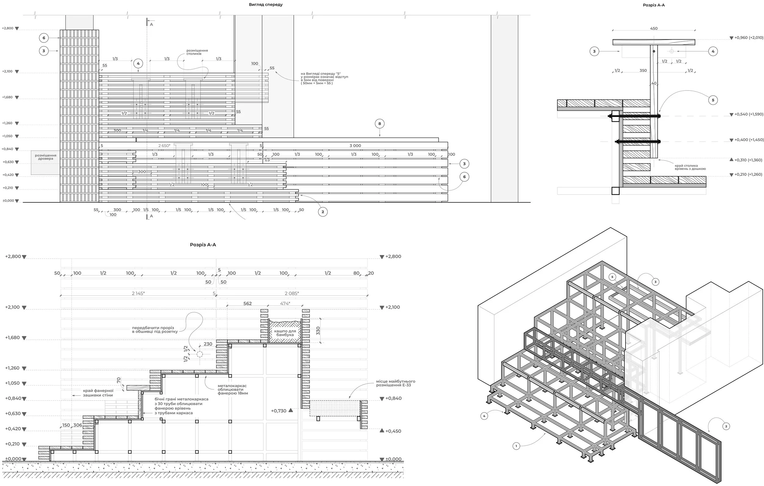 Амфітеатр – частина великого архітектурного об’єму, який зонує простір закладу. Цей об’єм починається з дерев’яної стільниці бару, яка перетікає в багаторівневі сходи, звідки плавно переходить у стінові панелі та дровер. Далі ці панелі завертають до зони санвузла, де об’єм завершується конструкцією умивальника.