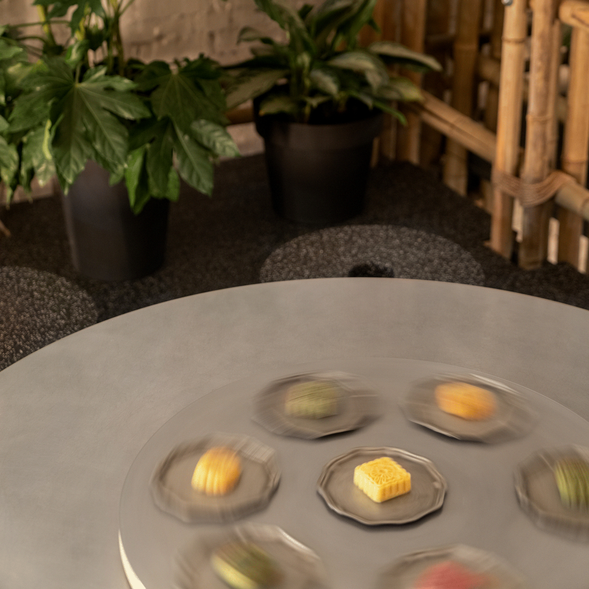 Домінантою простору є бамбукова антресоль у дальній частині зали. Під антресоллю – круглий стіл на 8–12 гостей, виготовлений із перфорованого металу за зразком вуличних столів для пікніка. На стільниці розмістили Lazy Susan – традиційну для китайських закладів платформу для закусок, яка крутиться навколо своєї осі.