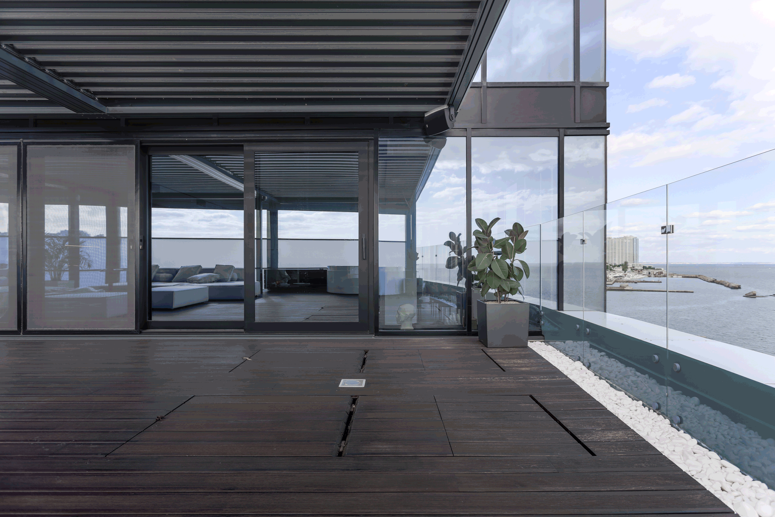 В інтер’єрі переважають нейтральні (біло/ сіро/ чорні) та природні відтінки, які перегукуються з кольором моря і доповнюють його. А завдяки відкритому плануванню морський пейзаж наче продовжується всередині приміщення.