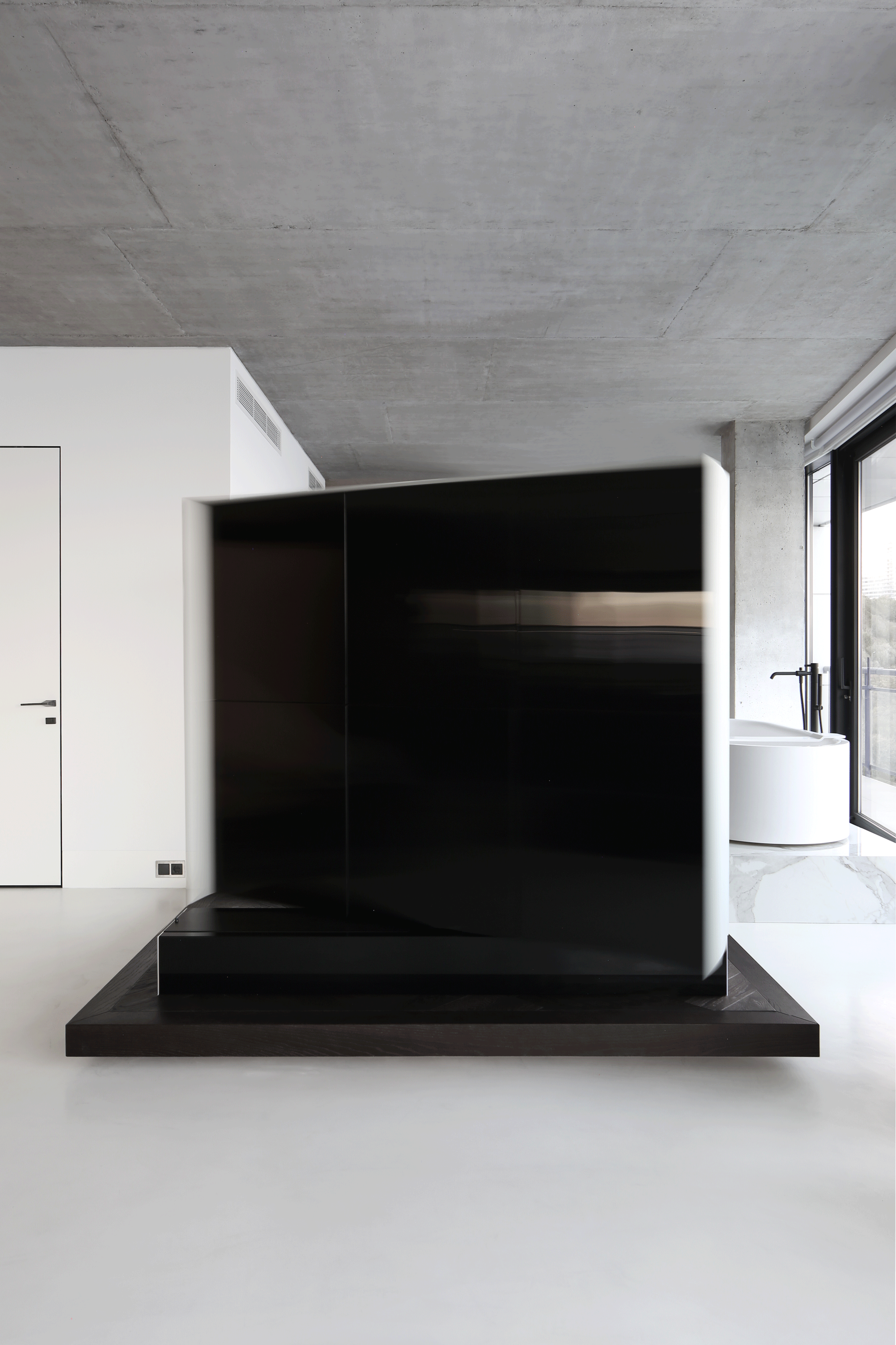 The interior is carried out in a minimalist style of sharp lines and restraint in decor and form. A notable element of the project is the white floor made of Baxab – relatively new material on the market – which is resistant to scratches and dirt. The flooring covers around 70% of the apartment area and houses a system of heat-insulation. Most of the ceiling is open concrete, with communication systems laid out behind drywall covering.