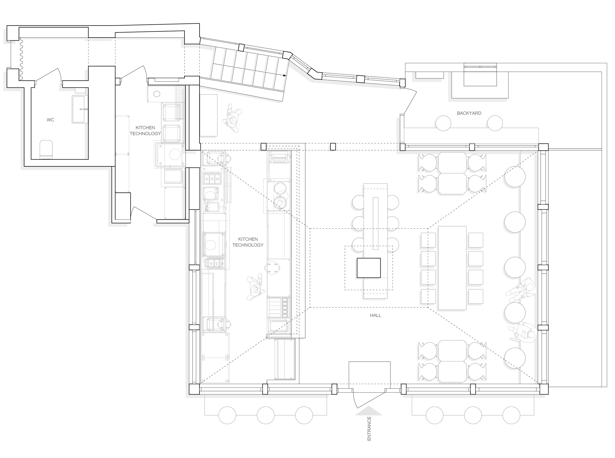 За запитом власника, вздовж усієї стіни мала діяти відкрита кухня, що накладало свої обмеження у плануванні. Зрештою ми запропонували варіант з 22 місцями всередині – з комунальним столом та різноформатною посадкою – та двома столиками у дворику.