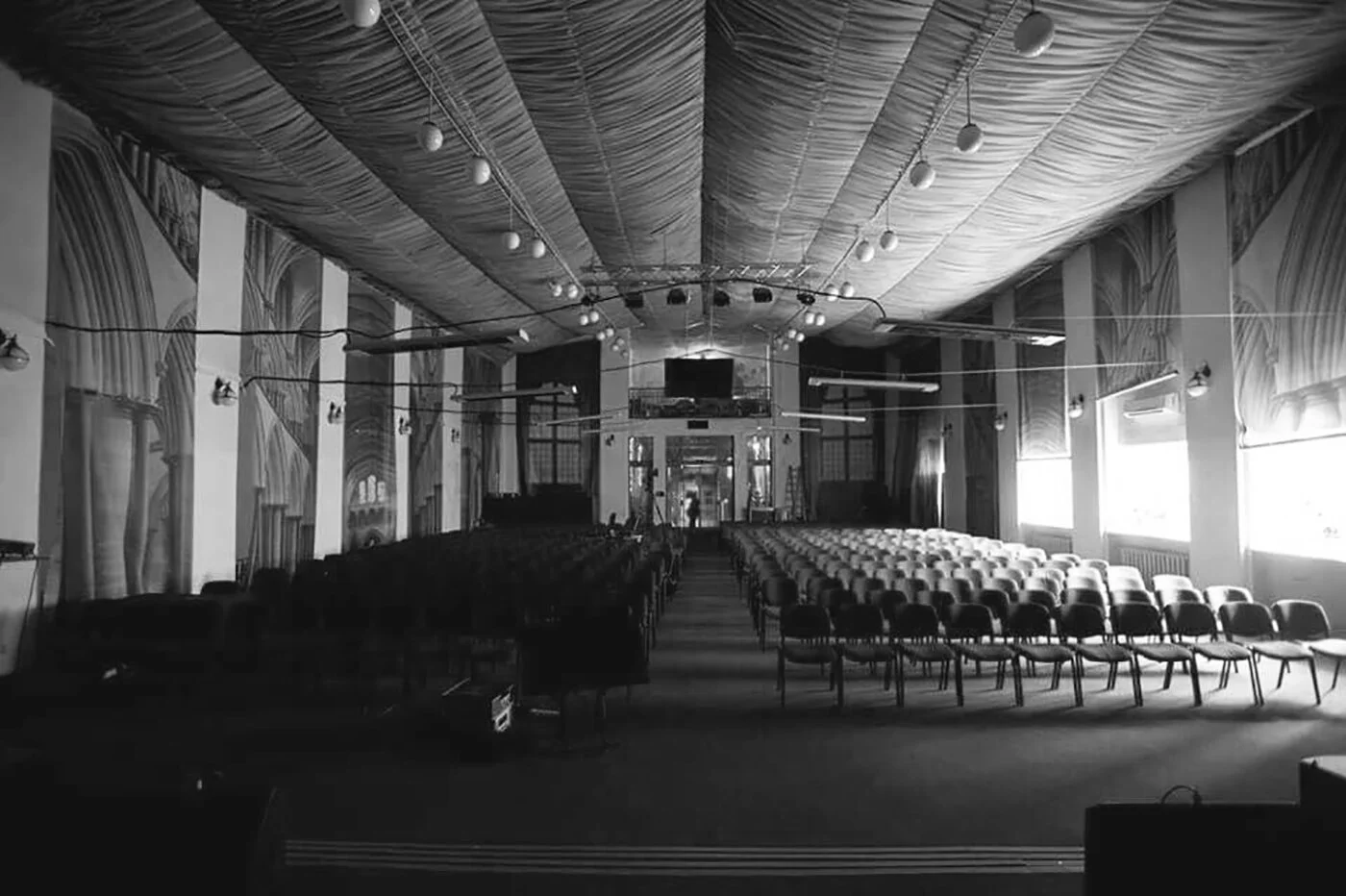 The cinema inhabited the first and part of the second floor and accommodated up to 800 people. Where there is now a green ceiling, there used to be a cinematographic facility with technical assistants, and on the site of the former buffet are now located the restrooms.