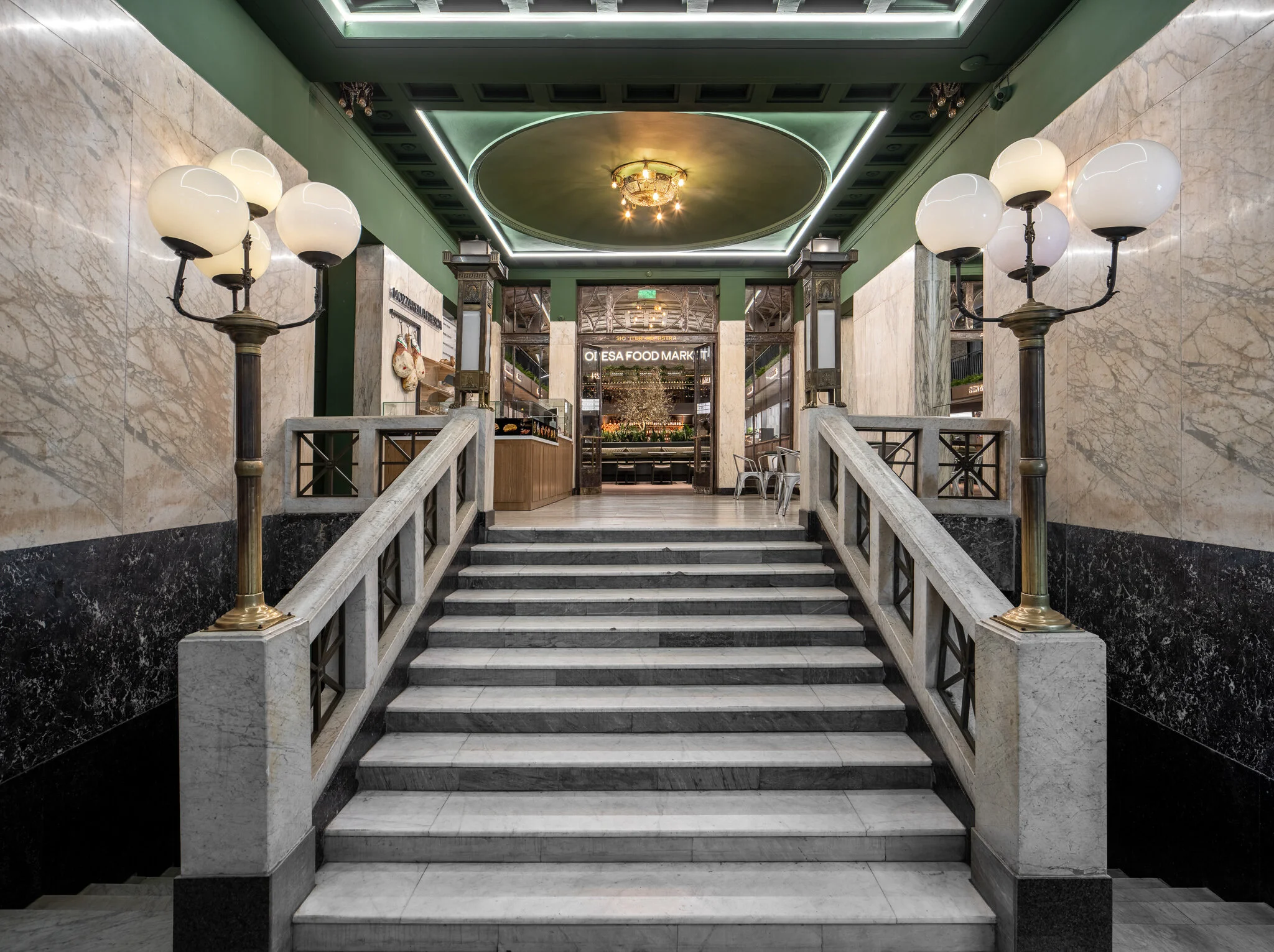 The market welcomes you with a festive marble staircase that leads into the main rectangular hall.