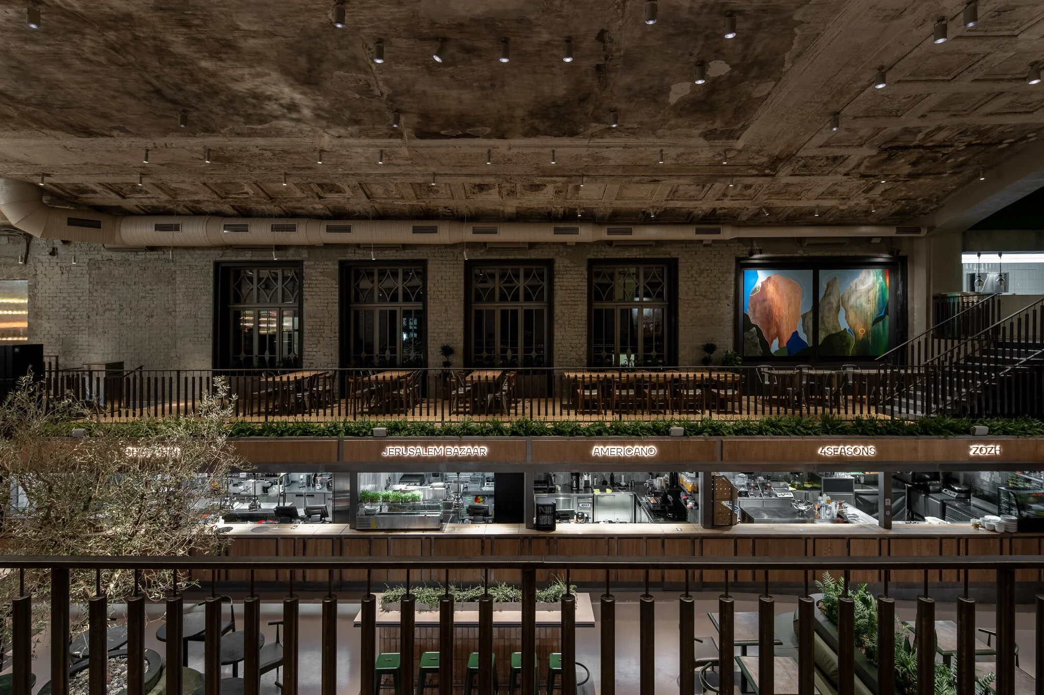 The central area of the hall offers various seating options, and at its very center, a round bench circles a large olive tree. To the left and right under the mezzanines are the food courts, and the end of the hall is occupied by a bar. Stairs to its right lead to the mezzanine on the second level with further seating options.