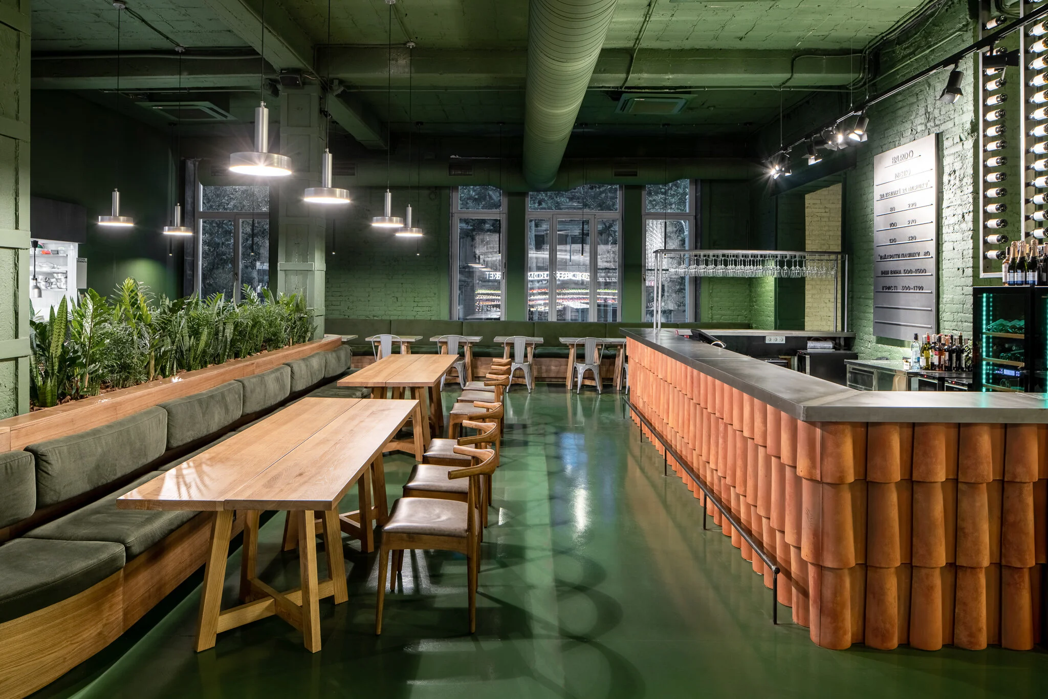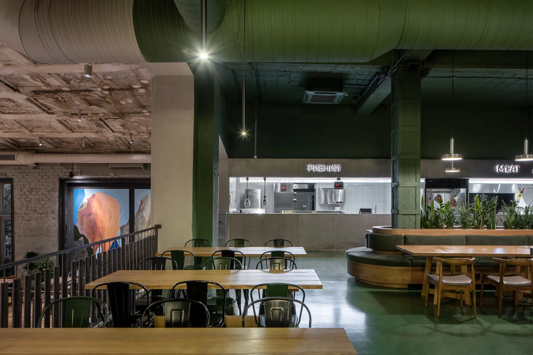 All food courts are coated with solid oiled oak and untreated, lacquered metal. The flooring of the second level is made of slightly tinted pine wood. The tables are made of ash, with part of the countertops of concrete. The bar on the ground floor is decorated with a 200-year-old brick that was found at a dismantling facility in Odesa. The particular green shade of the walls was settled on after three weeks of careful selecting. The ceiling was painted by hand with a brush by the decorator, whilst standing on a scaffolding 15 meters high.