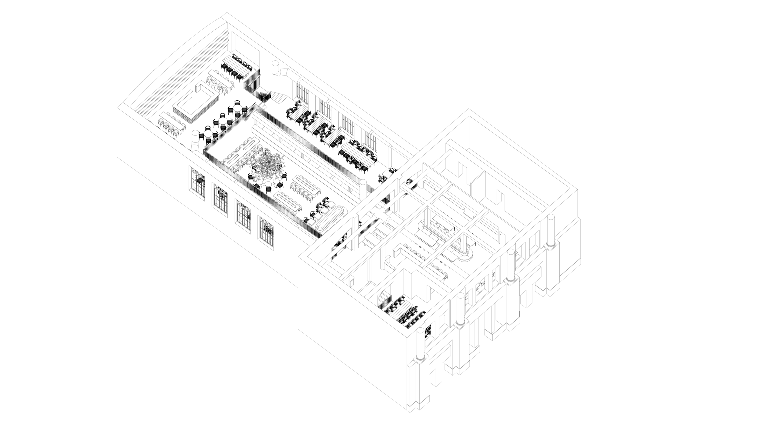 Посередині зали організована посадка різного формату, у самому центрі композиції — кругла лавка довкола великого оливкового дерева. Ліворуч і праворуч під антресолями розміщені фудкорти, а на торці — бар. Сходи праворуч від нього ведуть на антресолі другого рівня, де теж облаштована посадка.