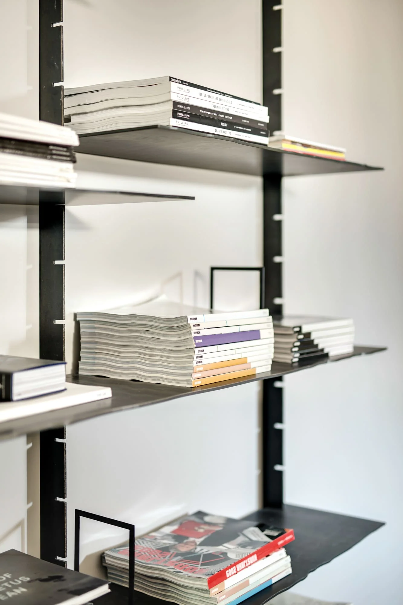 Architects used 6 mm steel sheets to manufacture book shelves which made the frame transparent and light. Console shelves for oversize materials keep the grand weight and strict horizont at the same time. In order to make the edge of the metallic construction original, it resembles the Dnipro river shoreline.