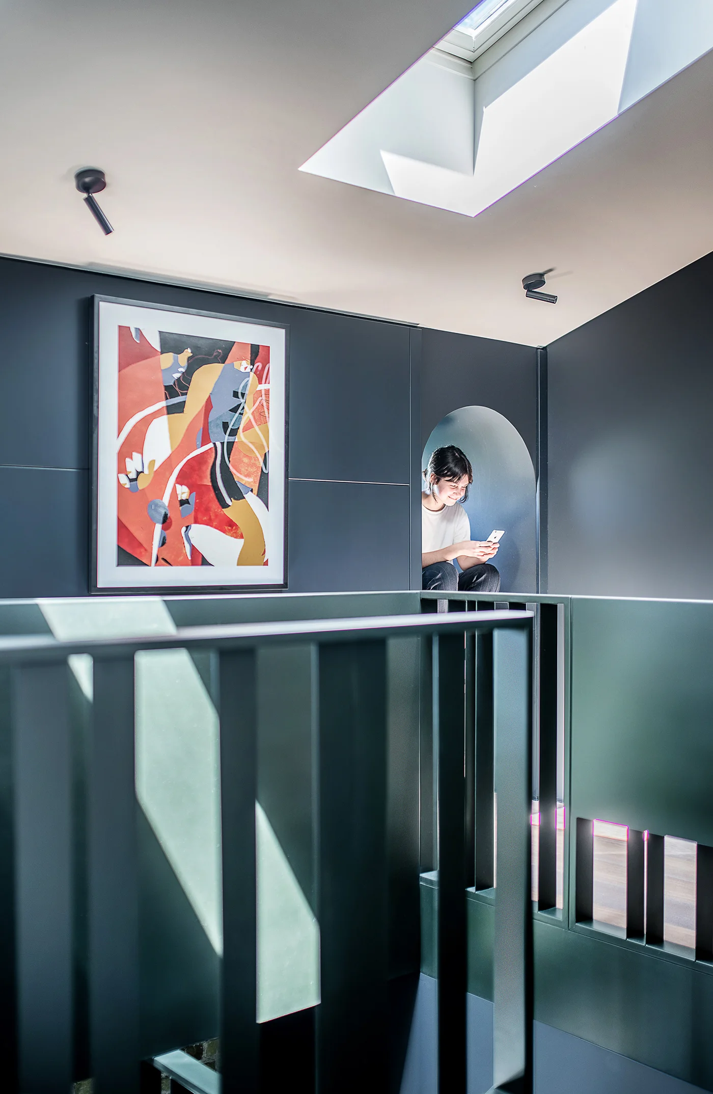 Since the second floor is built on the top of the mansard roof, where both walls and windows are not perpendicular to the floor, the architects took a decision to hide them behind absolutely even panels placing the pantry in there.