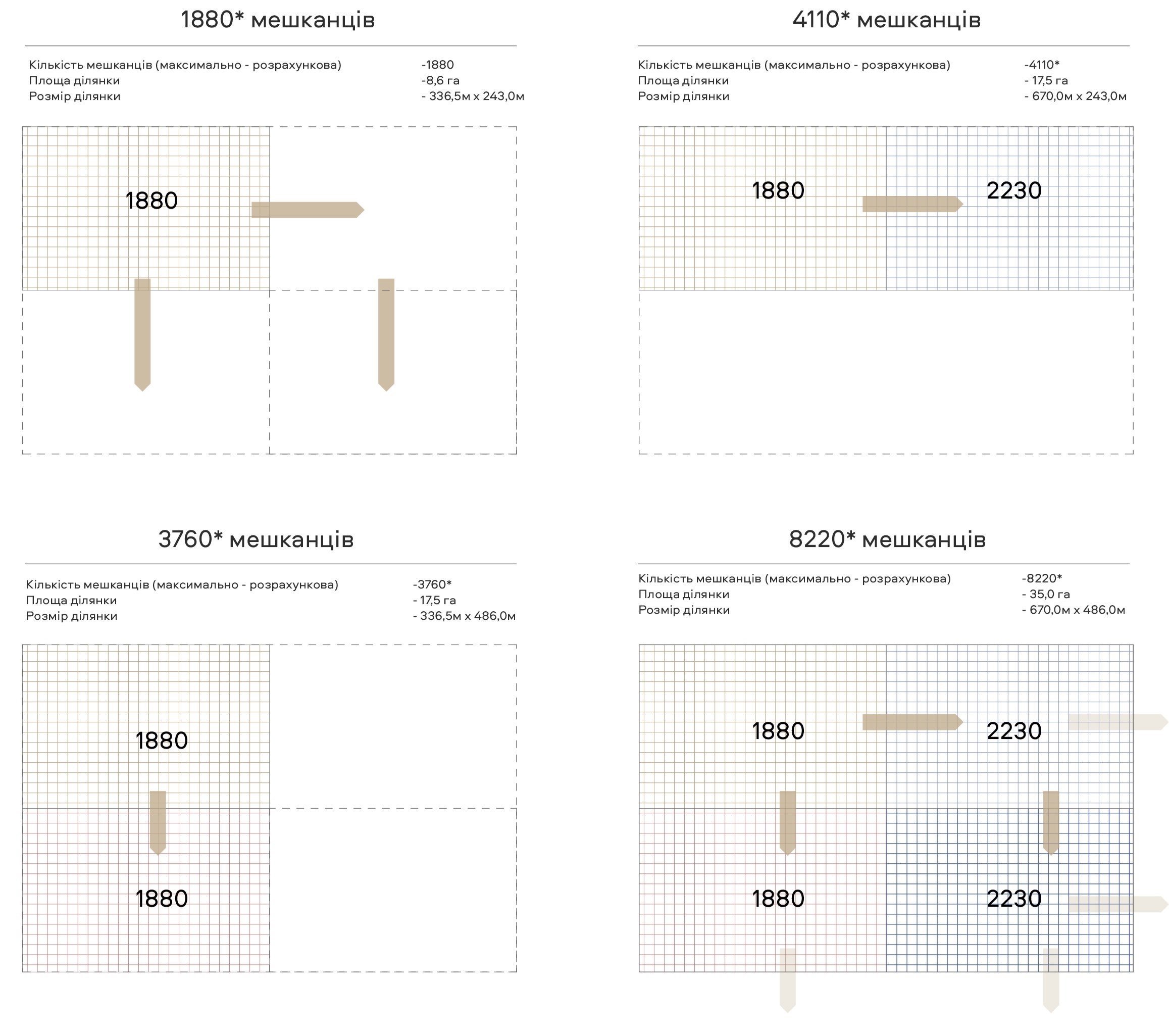 Розмір житлового блоку – це величина, яка задає розмір усім іншим проєктним одиницям. Цей розмір універсальний, тобто можна побудувати містечко з будь-яких запропонованих блоків, які відповідатимуть конкретним запитам.