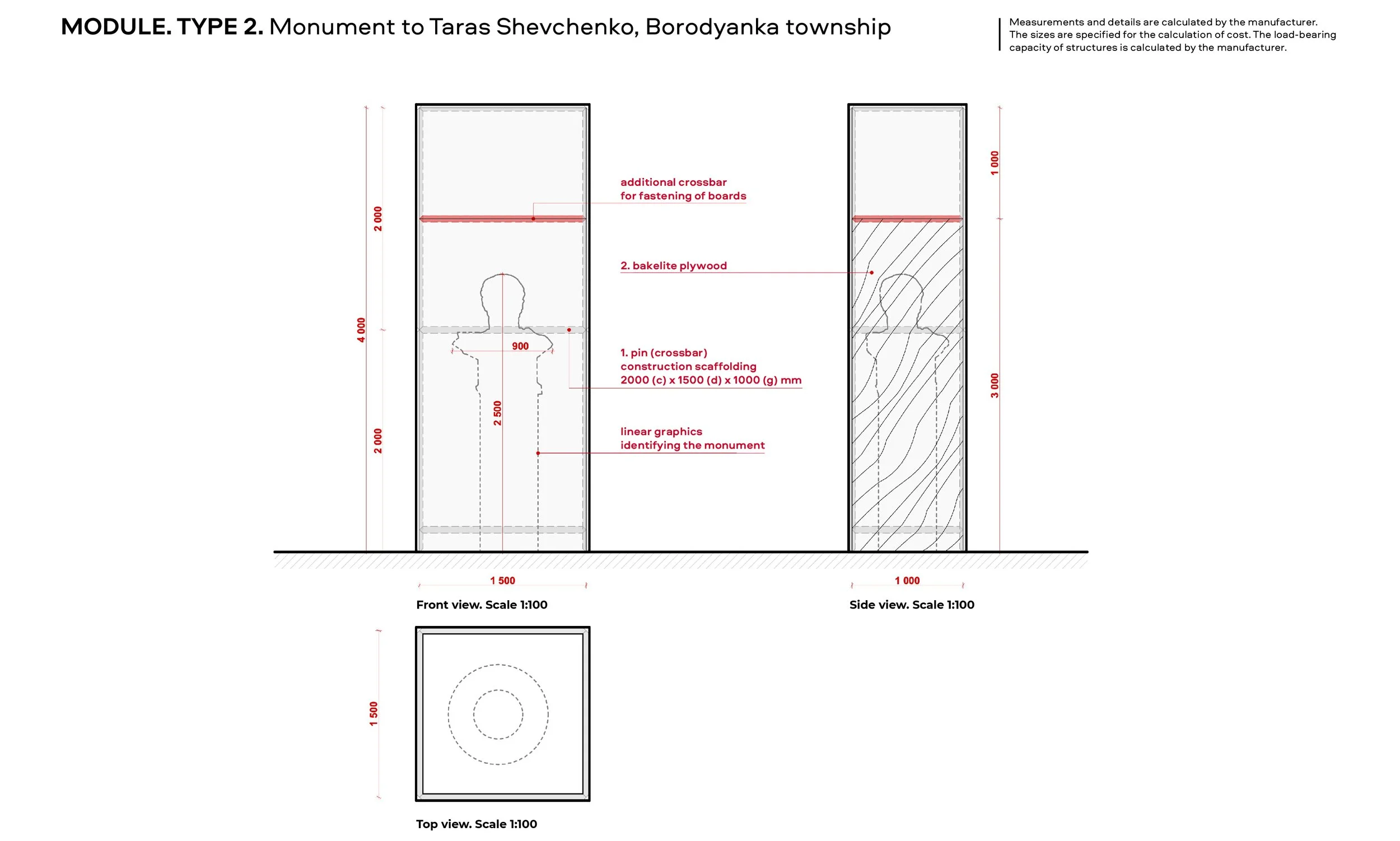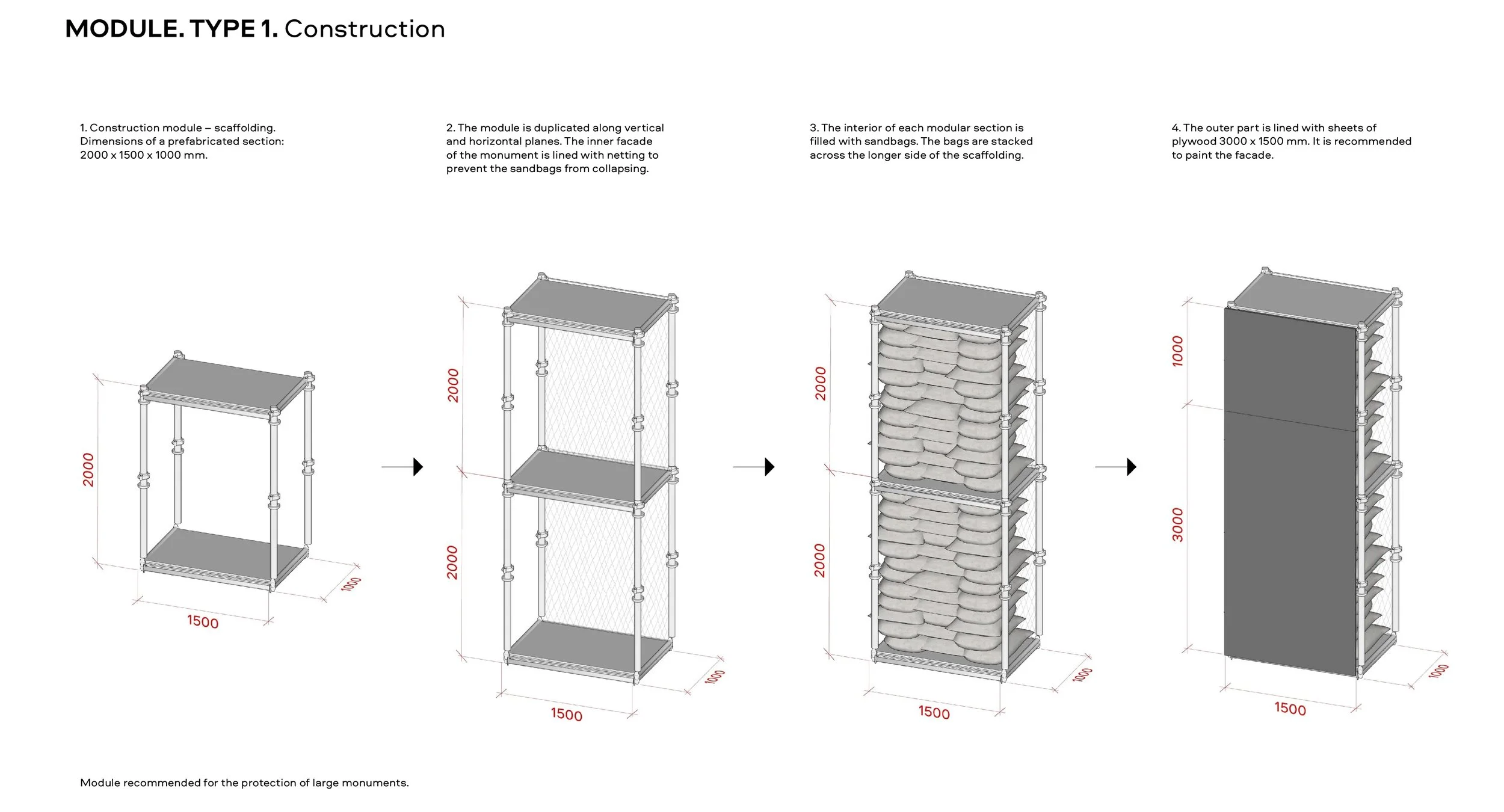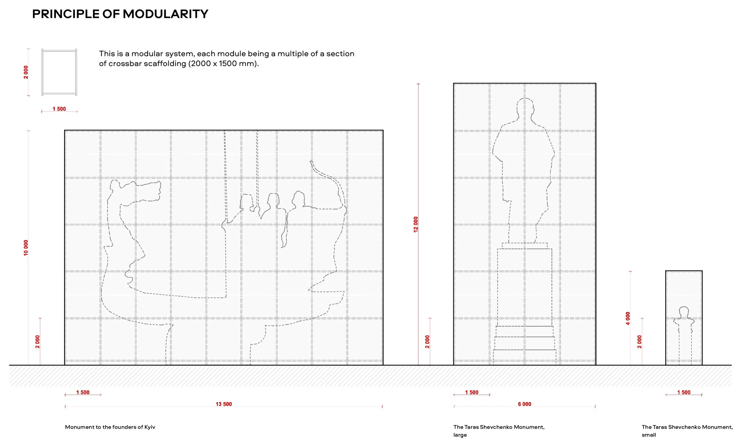 The RE:Ukraine Monuments system is based on the principle of modularity. The standard size module (2000 x 1500 mm) can be duplicated vertically and horizontally.
