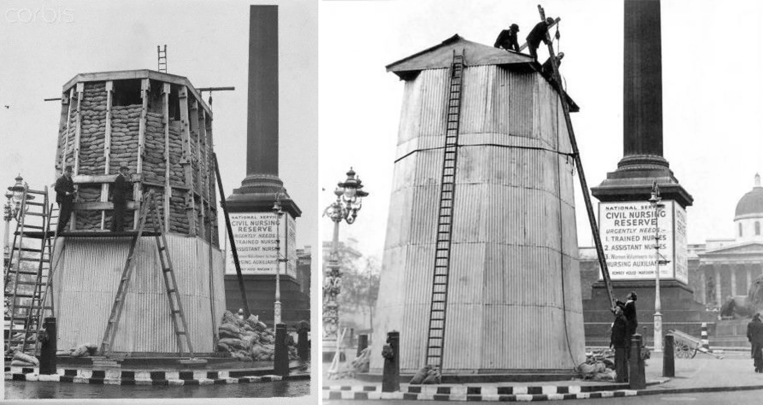 If the monument is largescale, the inner facade is fenced with netting, and the space between the plywood and the netting is filled with sandbags. This is a time-tested technique: sandbags, known for being able to withstand bullets and debris, have been used for these purposes since World War II.