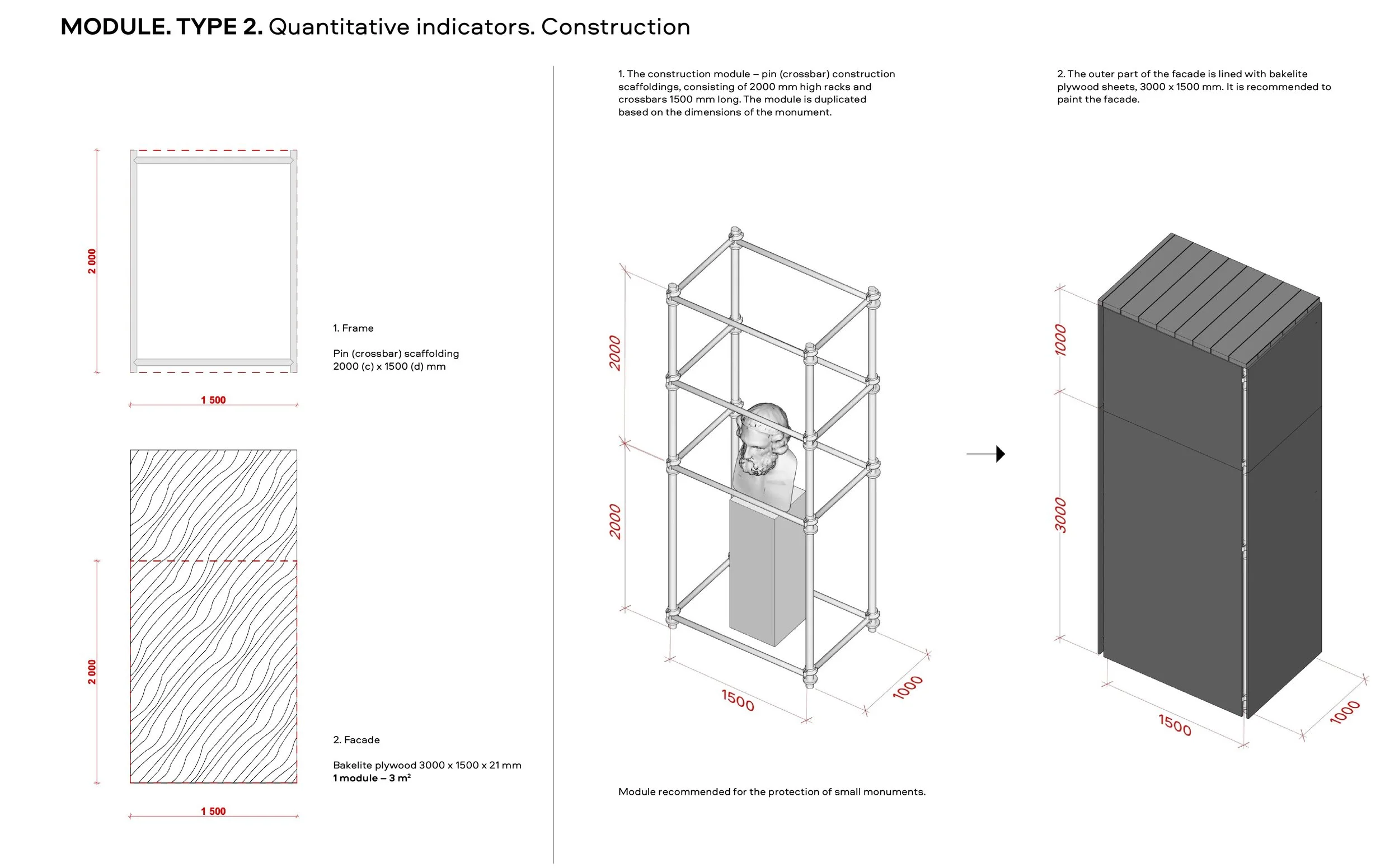 In order to identify the monument concealed under the protective structure, an image with the outlines of the monument and information about it is applied onto the facade of the box: the name, year of installation, authorship, and a brief historical reference. In addition, there is space for a QR code that will lead to the monument’s Wikipedia page.