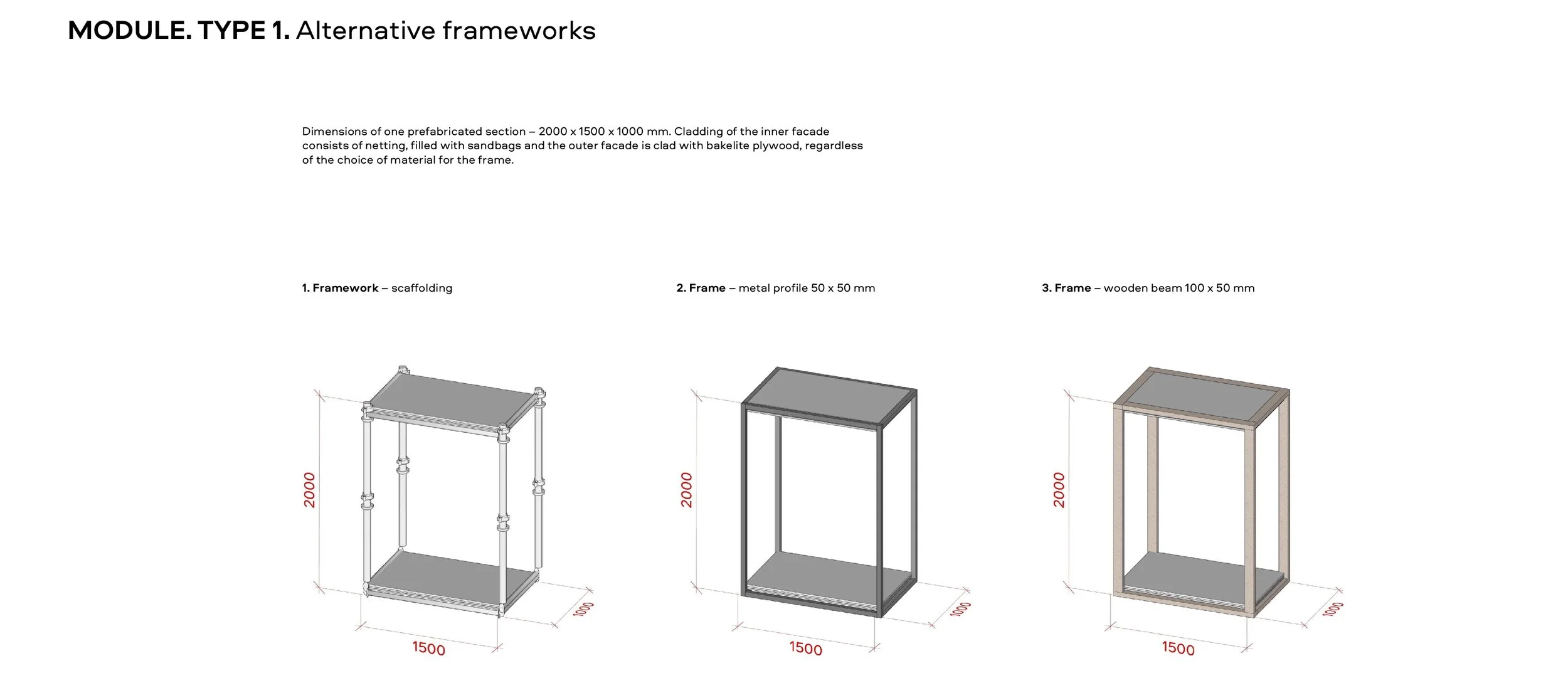 We propose the framework of the module to be constructed using crossbar scaffolding. Crossbars and uprights, available in several fixed sizes, are easy to find, deliver and assemble on site, constructor-style.