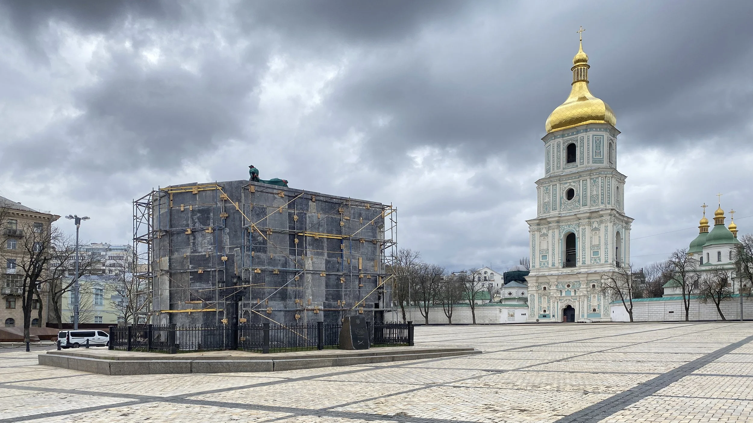 Kyiv, 2022. Protection: scaffolding + shields. Photo credits: @УНІАН, @vogue.ua