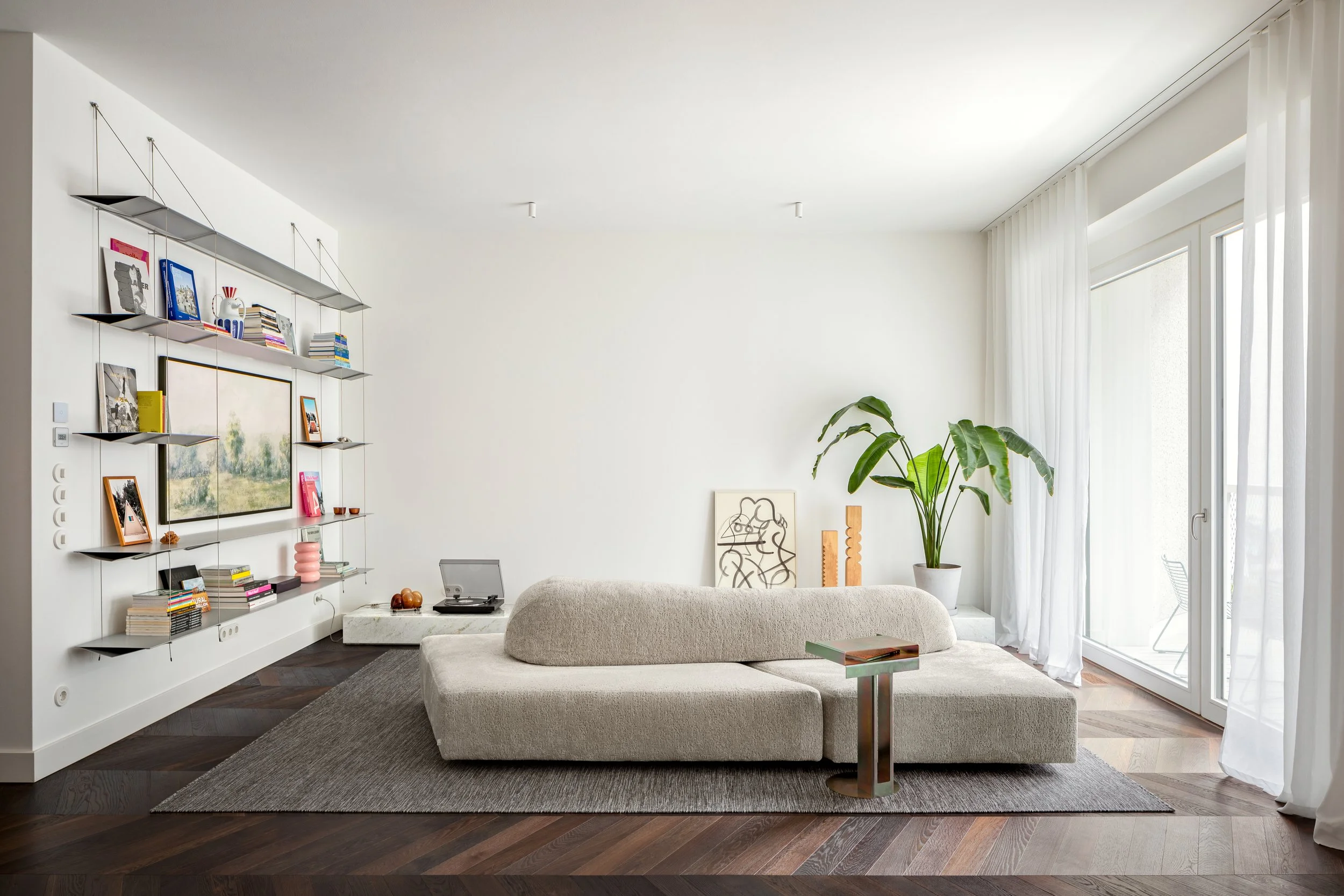A stone shelf stretching along the wall opposite the sofa serves to display the art collection, housing a record player and a Bubble Light by Balzer Balzer made of glass. The wall in the living room is adorned with Nexus shelves by Ben Hoek, which frame the TV.