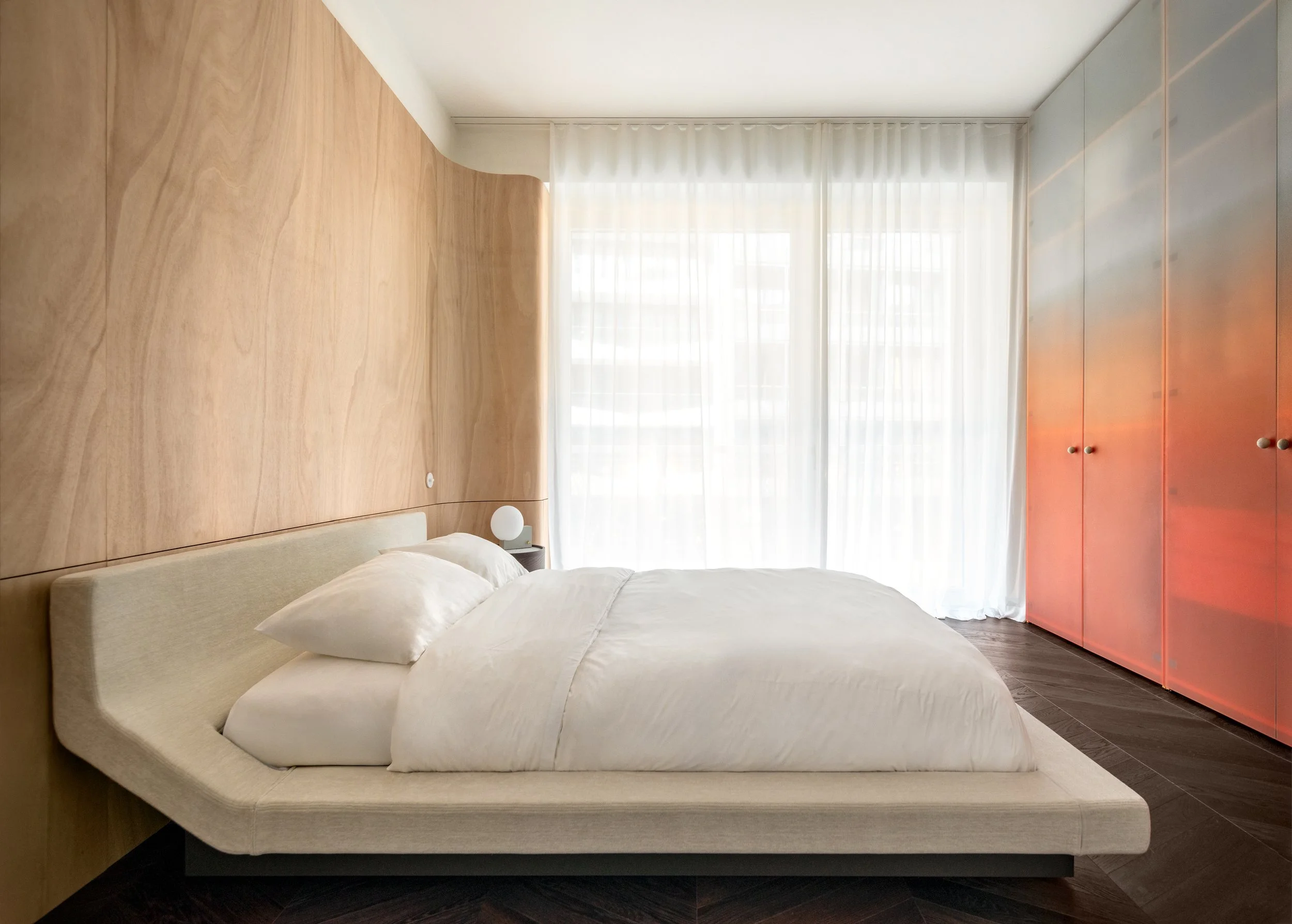 The semi-transparent wardrobe is a custom-made homage to Sabine Marcelis' works and her interpretation of shapes and colors. The colored frame of the cabinet is crafted to match the glass doors of the facade. The glass is gradient-painted from deep peach to nearly matte white. The cabinet handles are made of travertine.