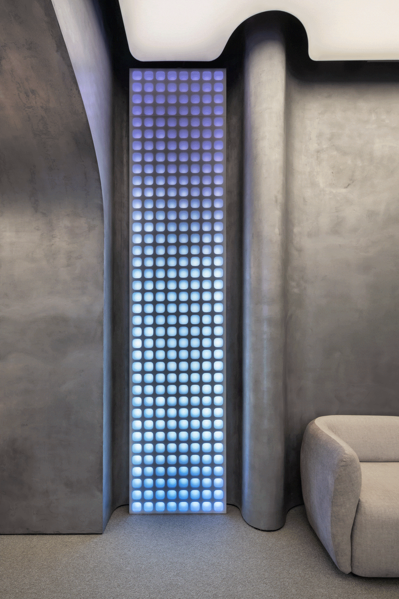 One of the distinctive features of the Symbol interior is the wavy walls with a metallic effect, which set the tone for the rest of the design elements. Its execution was far from simple; the contour of the walls moves in complex curves, not simple radii. After mapping them out on the floor, a frame of closely spaced wall profiles was assembled, to which plasterboard cut into thin strips was attached.