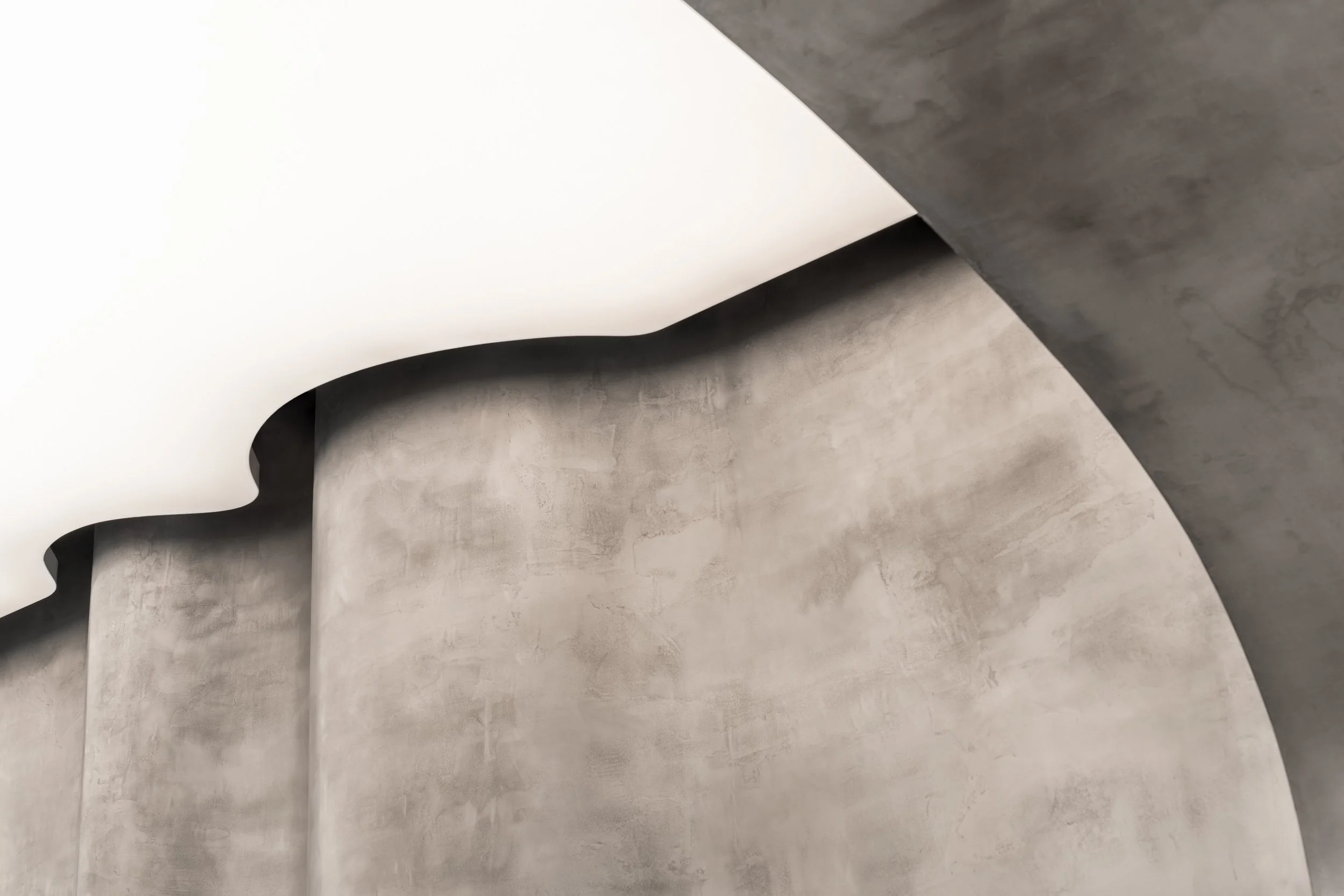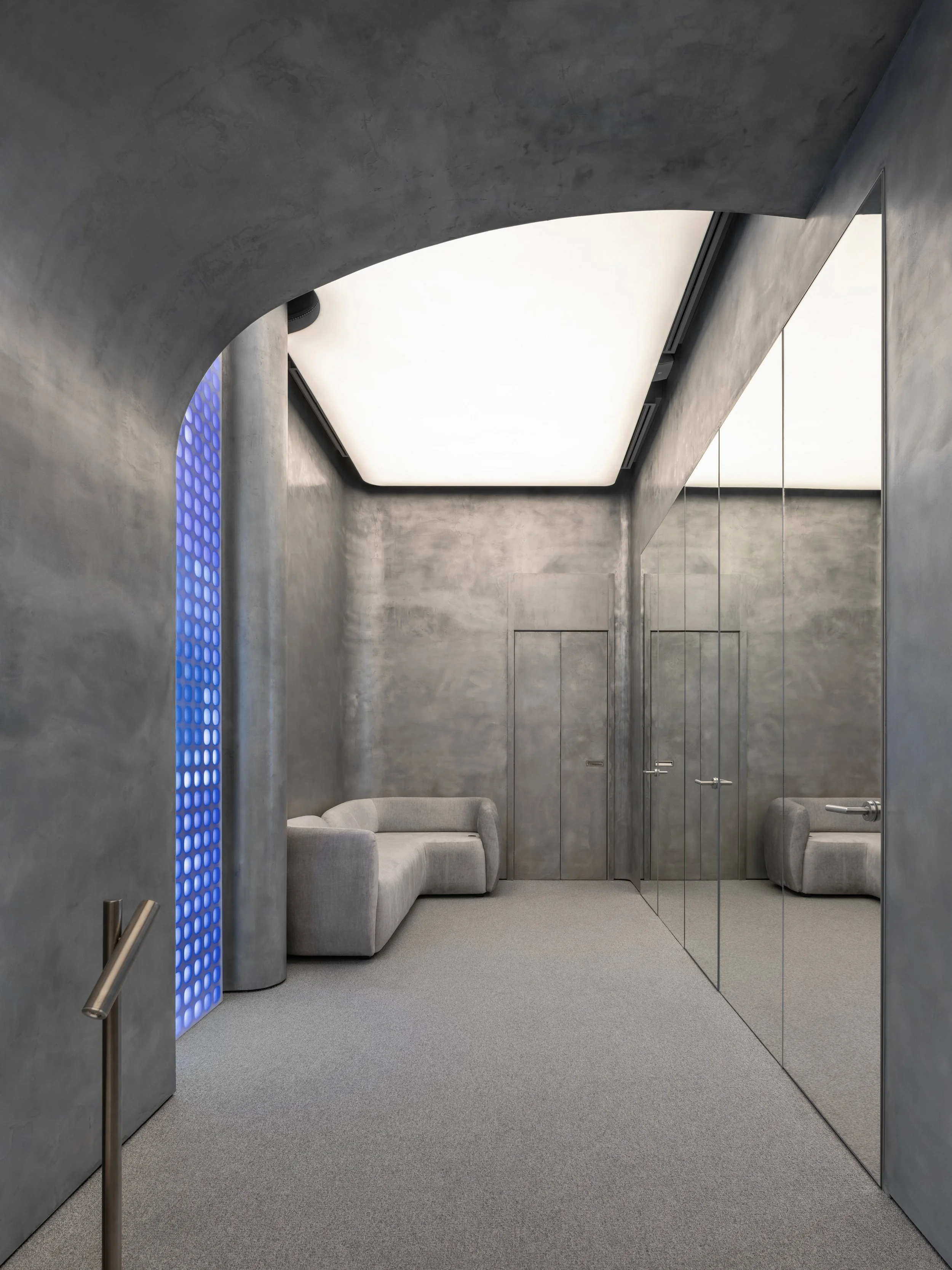 The metallic shine of the walls was achieved with the help of plaster. Among the various options, the most balanced one was selected, both vibrant and practical. Decorative plaster was used, with a metallic effect achieved by polishing with wax. Before installation, every curve of the surface of the frame had to be perfectly polished. Microcement is used as flooring on the first floor, which, due to its smooth and flexible nature, encovers the reception desk and stands in the exhibition area, making the furniture seem as if it has grown out of the floor.The fitting room area is carpeted to match the plaster and concrete, creating a uniform color block.