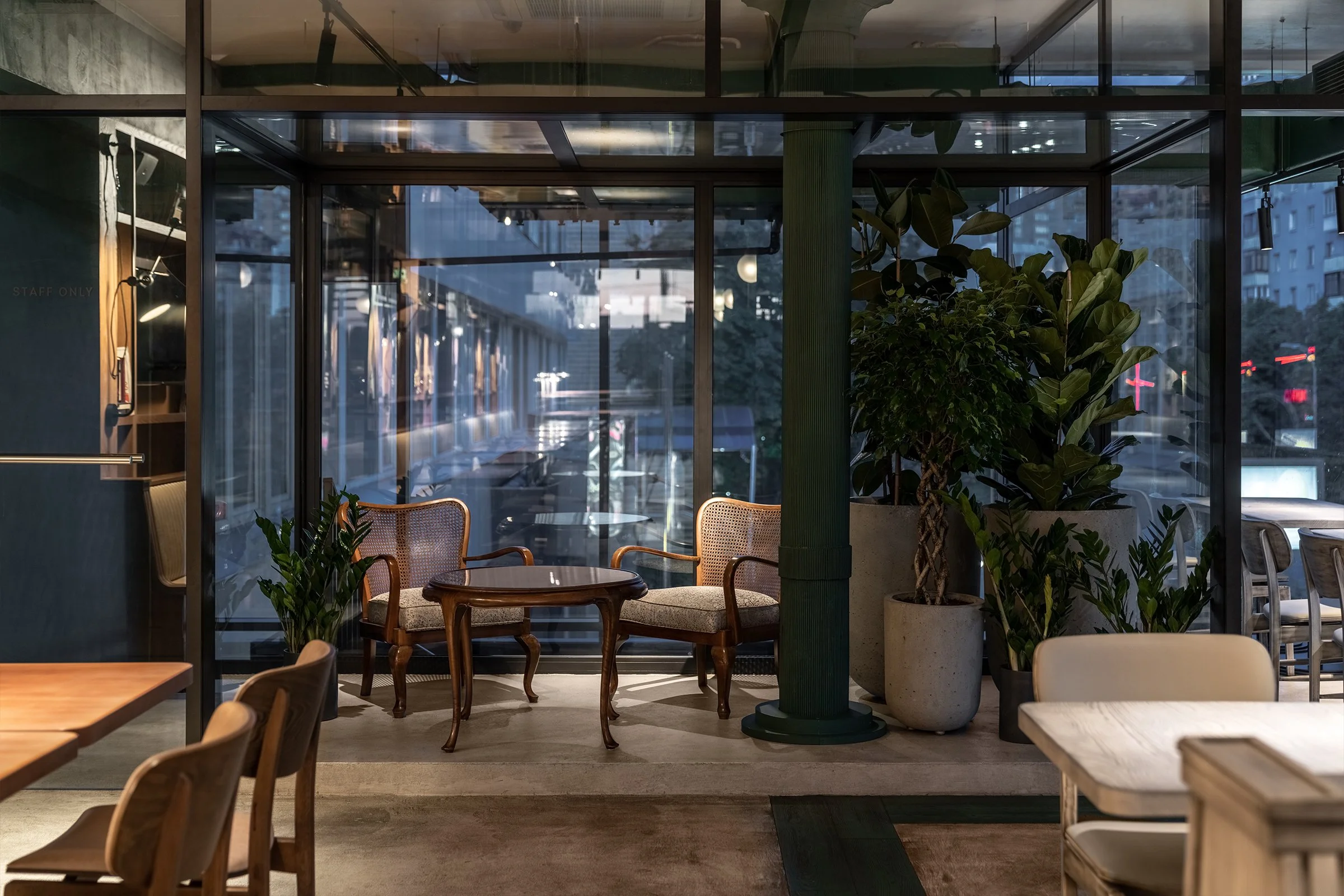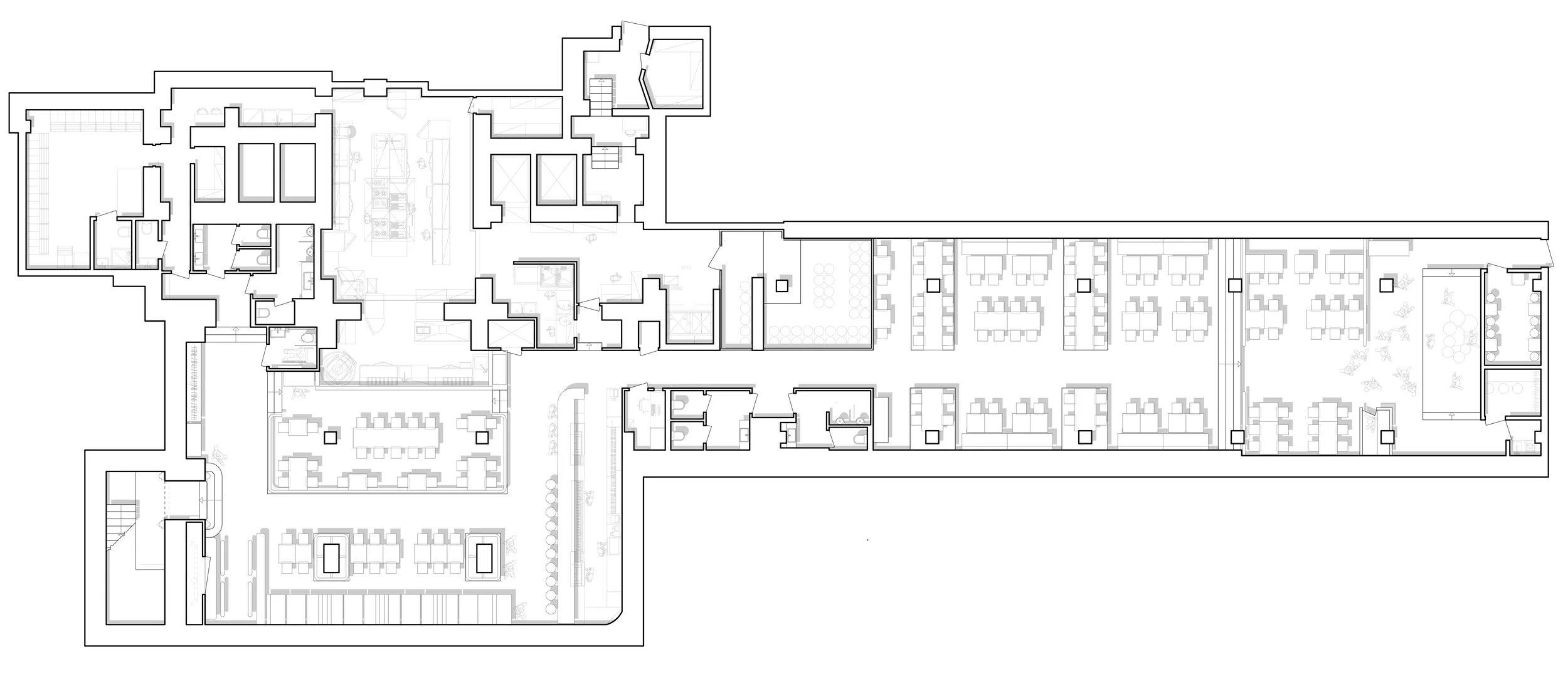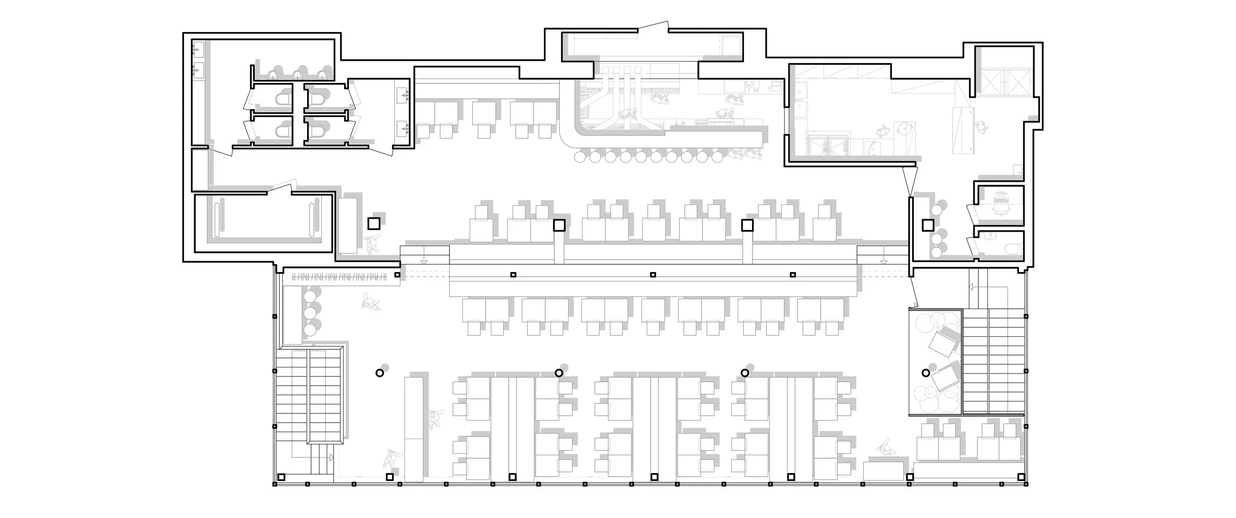 Посадка на цьому поверсі змішана: обідня й барна, тверда та м’яка. В основній залі є неформальна зона для виступів: замість класичної сцени – два крісла в оточенні кашпо з рослинами.