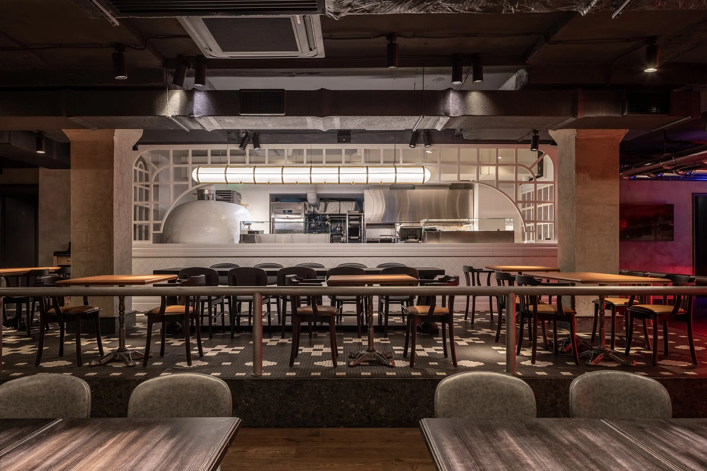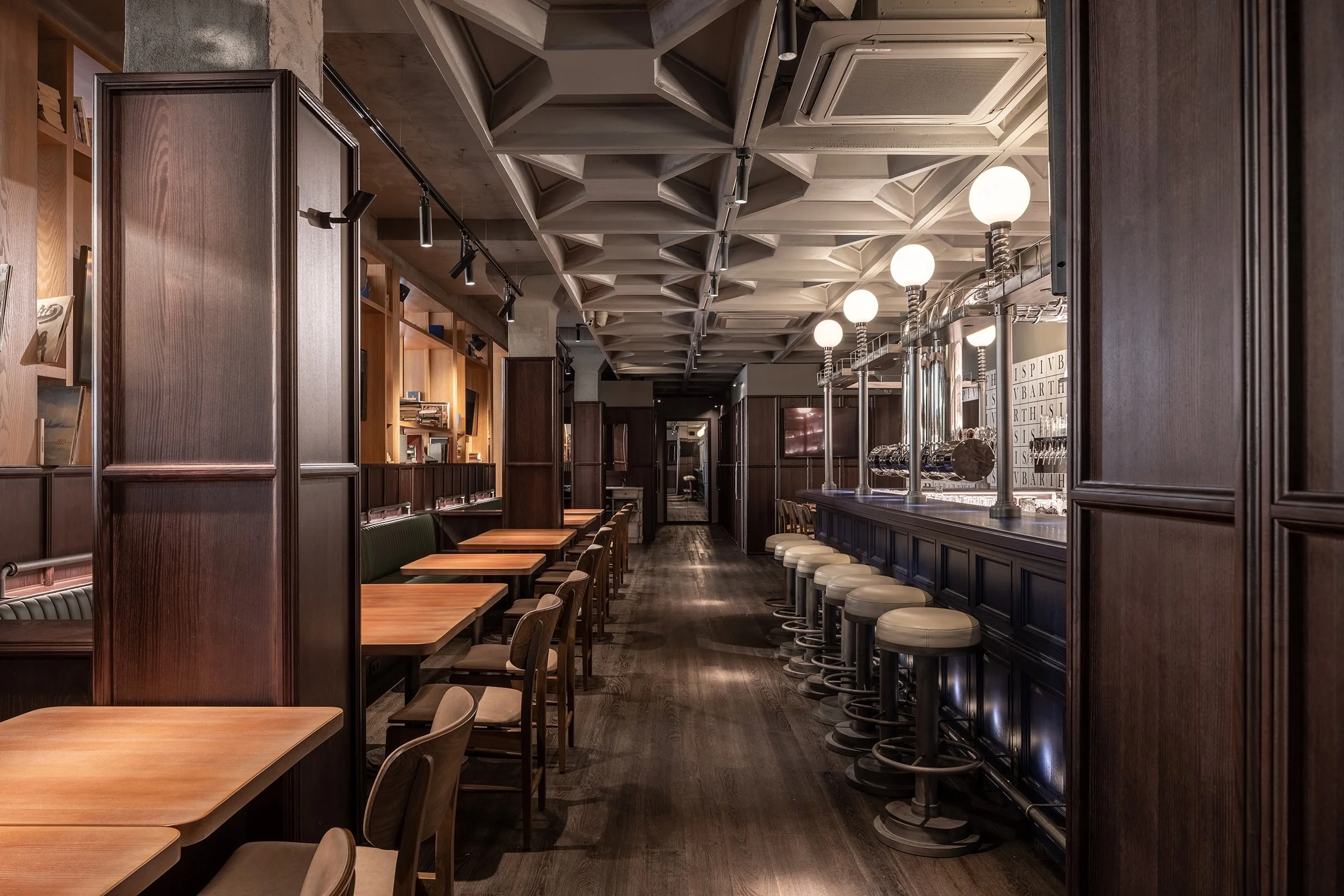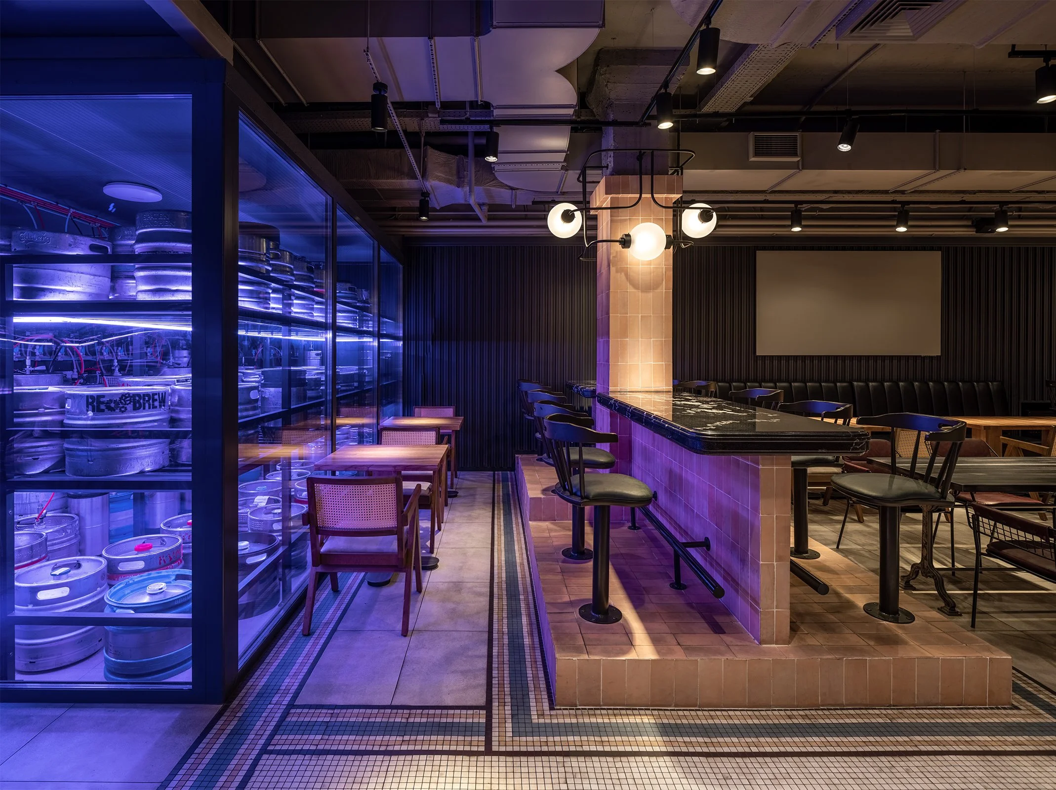 Водночас було важливо зберегти елементи, присутні в решті ресторанів: організувати зони очікування для гостей та закласти місце для пітонів – артерій, якими пиво потрапляє з колдруму до бару.