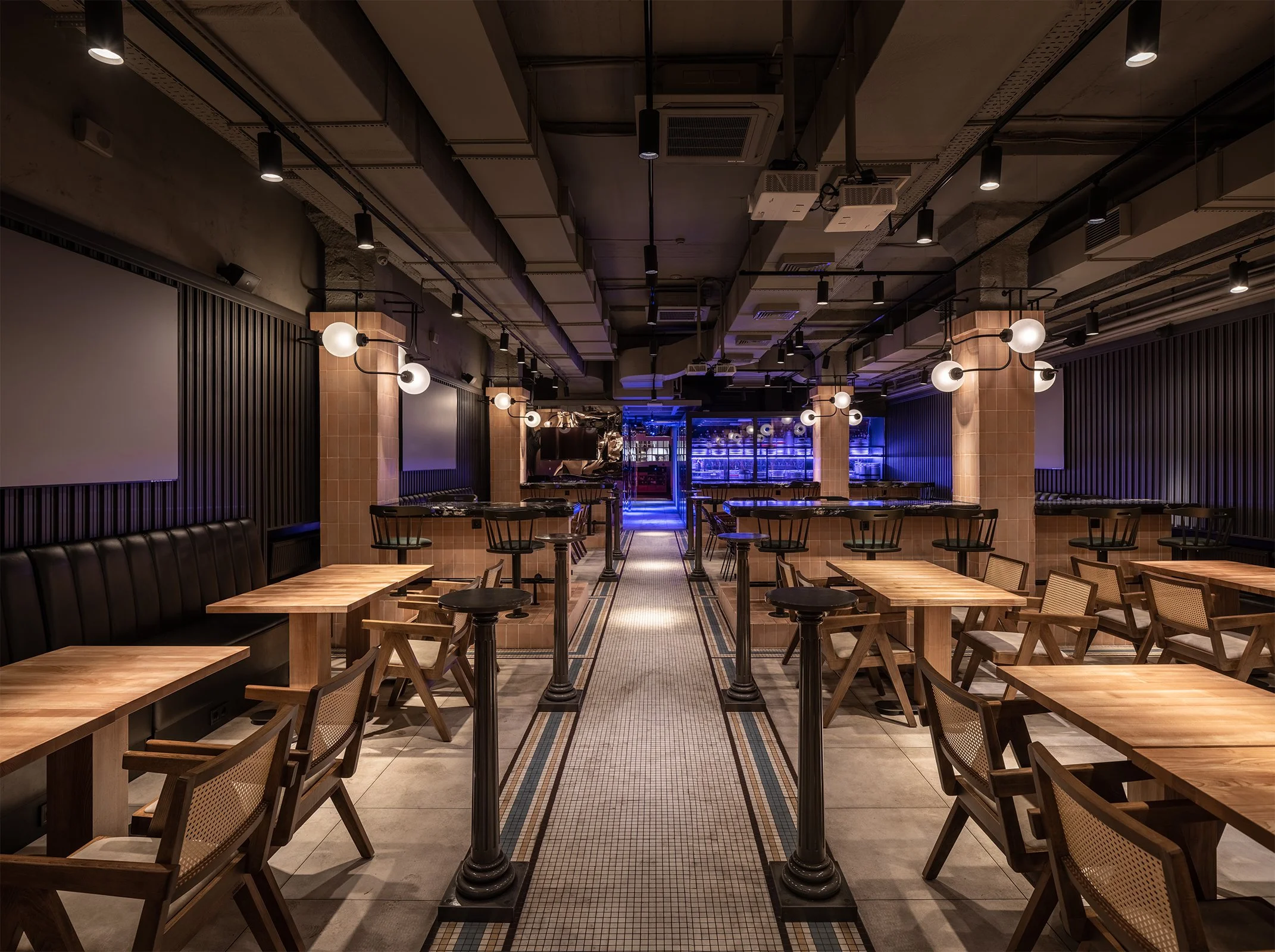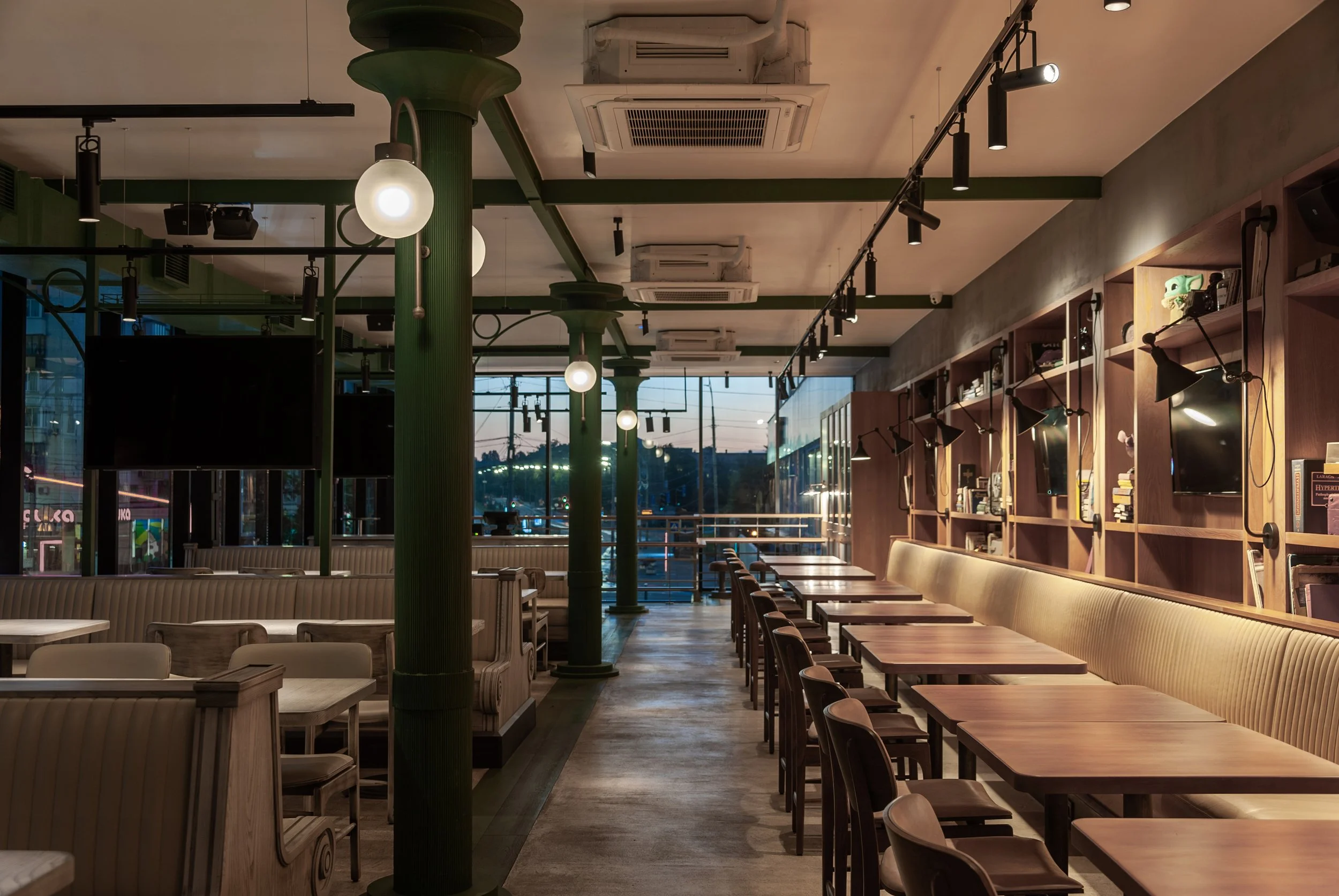 At the same time, it was important to preserve the elements present in other restaurants: to provide waiting areas for guests and make room for the pythons – arteries through which beer flows from the coldroom to the bar.