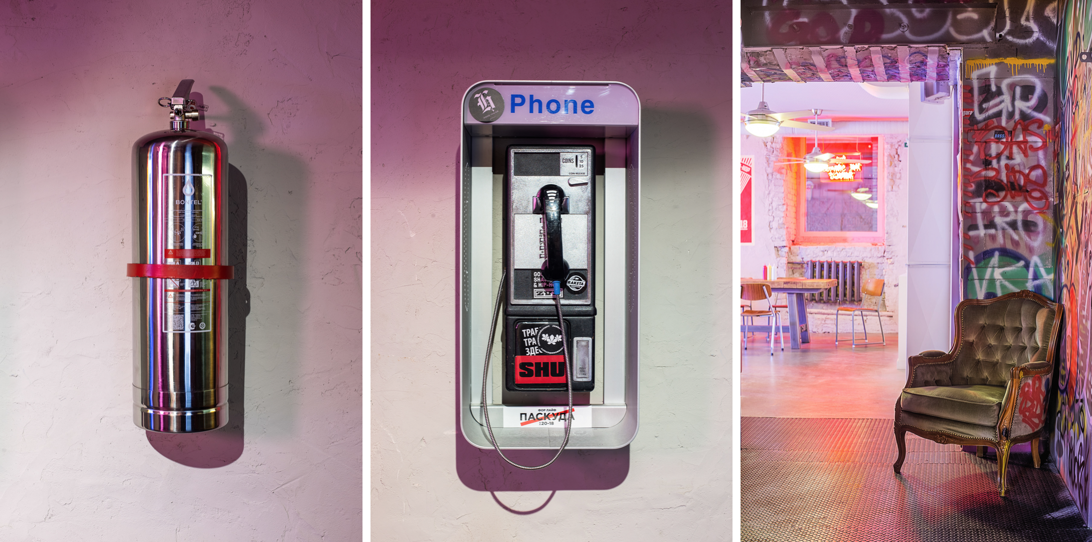 The establishment is cozy, bright, rich in elements and various photo zones. Meeting the needs of guests, it is modern and flexible for hosting events of different formats. Textures and finishes are from natural materials: wood, metal, leather. The color scheme is of sand shades. Such palette unveils an open space during the day, and conveys reflections of neon lights at night. The restaurant is divided into three rooms, each with its own theme and seating arrangement. While first and second room are light and open, the third is executed in dark colors and well suited for evenings, with more private and intimate atmosphere.The most striking elements of décor are tumble dryers with rotating drums, and Mars and Pepsi vending machines doors, which conceal WC block behind them.